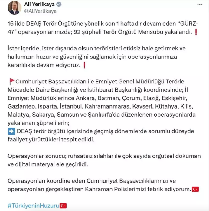 Bakan Yerlikaya, sosyal medya hesabından yaptığı açıklamada, son 1 haftada; Ankara, Batman, Çorum, Elazığ, Eskişehir, Gaziantep, Isparta, İstanbul, Kahramanmaraş, Kayseri, Kütahya, Kilis, Malatya, Sakarya, Samsun ve Şanlıurfa'da DEAŞ terör örgütüne yönelik 'Gürz-47' operasyonları düzenlendiğini belirtti. Operasyonda, DEAŞ terör örgütü içinde geçmiş dönemlerde sorumlu düzeyde faaliyet yürüttüğü tespit edilen 92 şüphelinin yakalandığını kaydeden Yerlikaya, "Operasyonlar sonucu; ruhsatsız silahlar ile çok sayıda örgütsel doküman ve dijital materyal ele geçirildi.