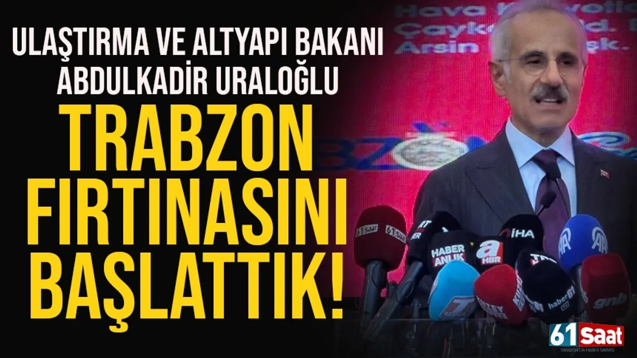 Ulaştırma ve Altyapı Bakanı Abdulkadir Uraloğlu, Ankara Trabzon Günleri’nin açılışında yaptığı konuşmada, Trabzon’un İstiklal Madalyası’na layık görülmesinden yeni havalimanı, raylı sistem ve hızlı tren projelerine kadar birçok konuda önemli açıklamalarda bulundu. Uraloğlu, “Trabzon fırtınasını başlattık ama bizim oralarda fırtına başlamaz; fırtına kopar” dedi.