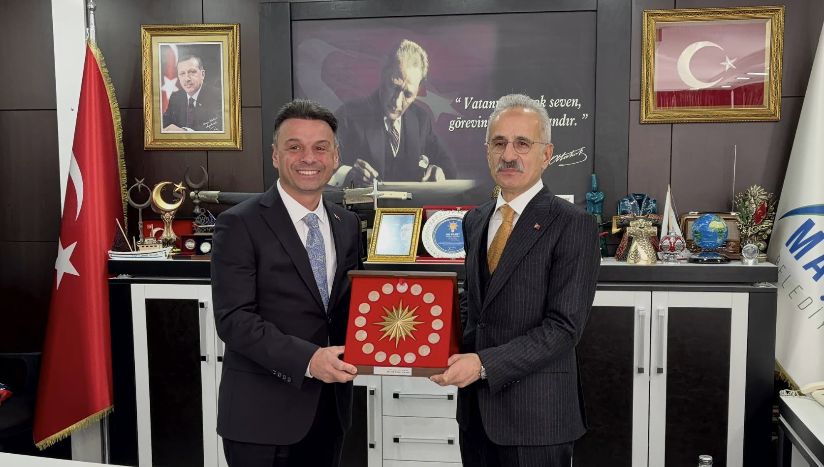 Saat 13.30’da Maçka Belediye Başkanlığı’nı ziyaret eden Bakan Uraloğlu’na, anlamlı hediyeler takdim edildi. Ziyarette, Türk devletlerini simgeleyen turnaların yer aldığı ve ortasında Cumhurbaşkanlığı forsu bulunan özel bir hediye ile Maçkalı kadınların el emeğiyle hazırladığı tesbih Bakan Uraloğlu’na sunuldu.