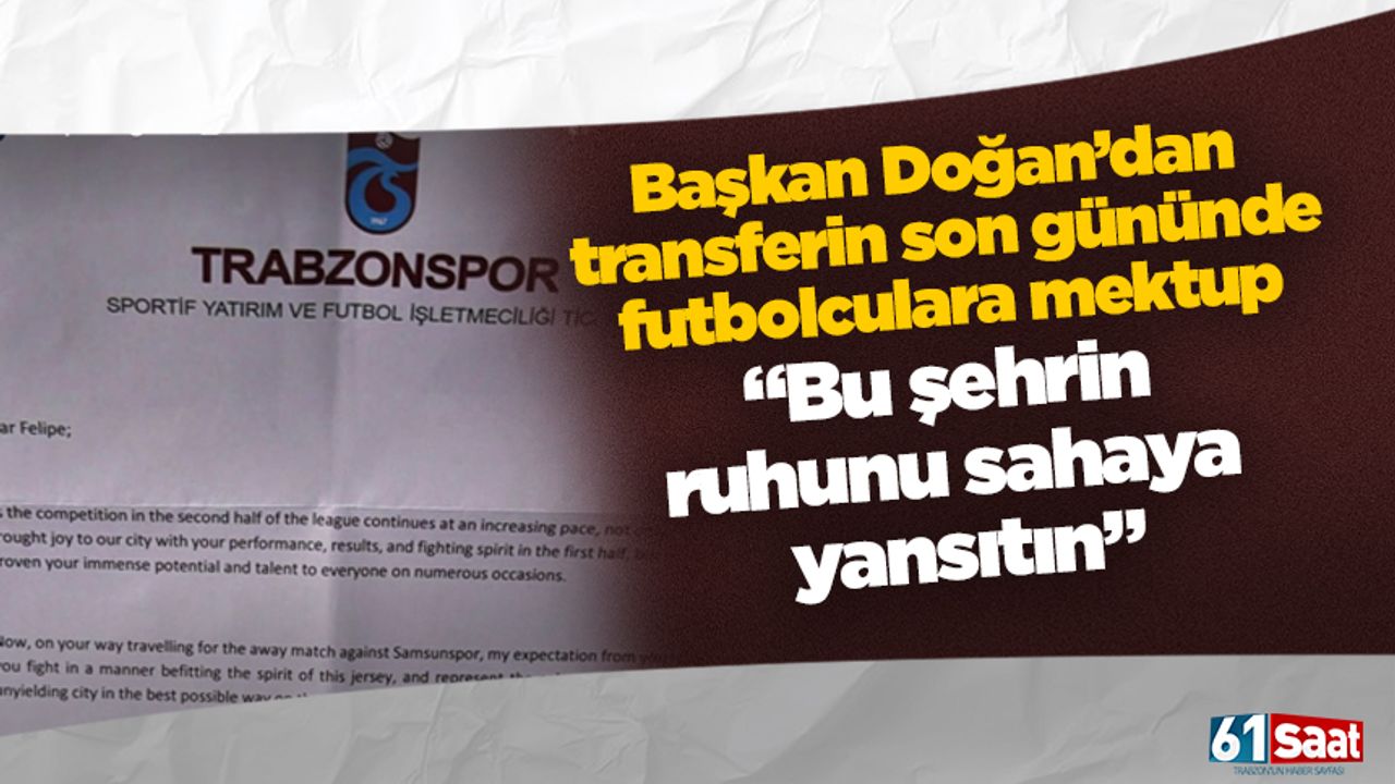 Trabzonspor Başkanı Ertuğrul Doğan, transfer döneminin son gününde mevcut kadroda yer alan futbolculara moral ve motivasyon amaçlı bir mektup gönderdi. Doğan, ligin ikinci yarısında artan rekabete dikkat çekerken, oyuncuların ilk yarıdaki performanslarının camiaya büyük sevinç yaşattığını ifade etti.