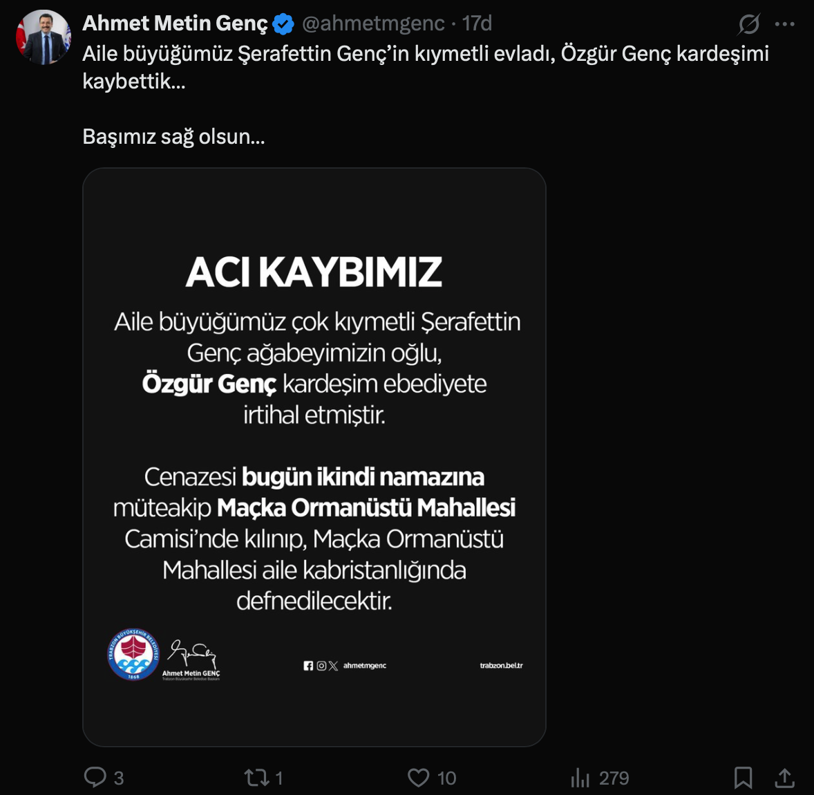 Başkan Genç’in sosyal medya hesabında yayınlanan mesajda, “Aile büyüğümüz çok kıymetli Şerafettin Genç ağabeyimizin oğlu, Özgür Genç kardeşim ebediyete irtihal etmiştir.