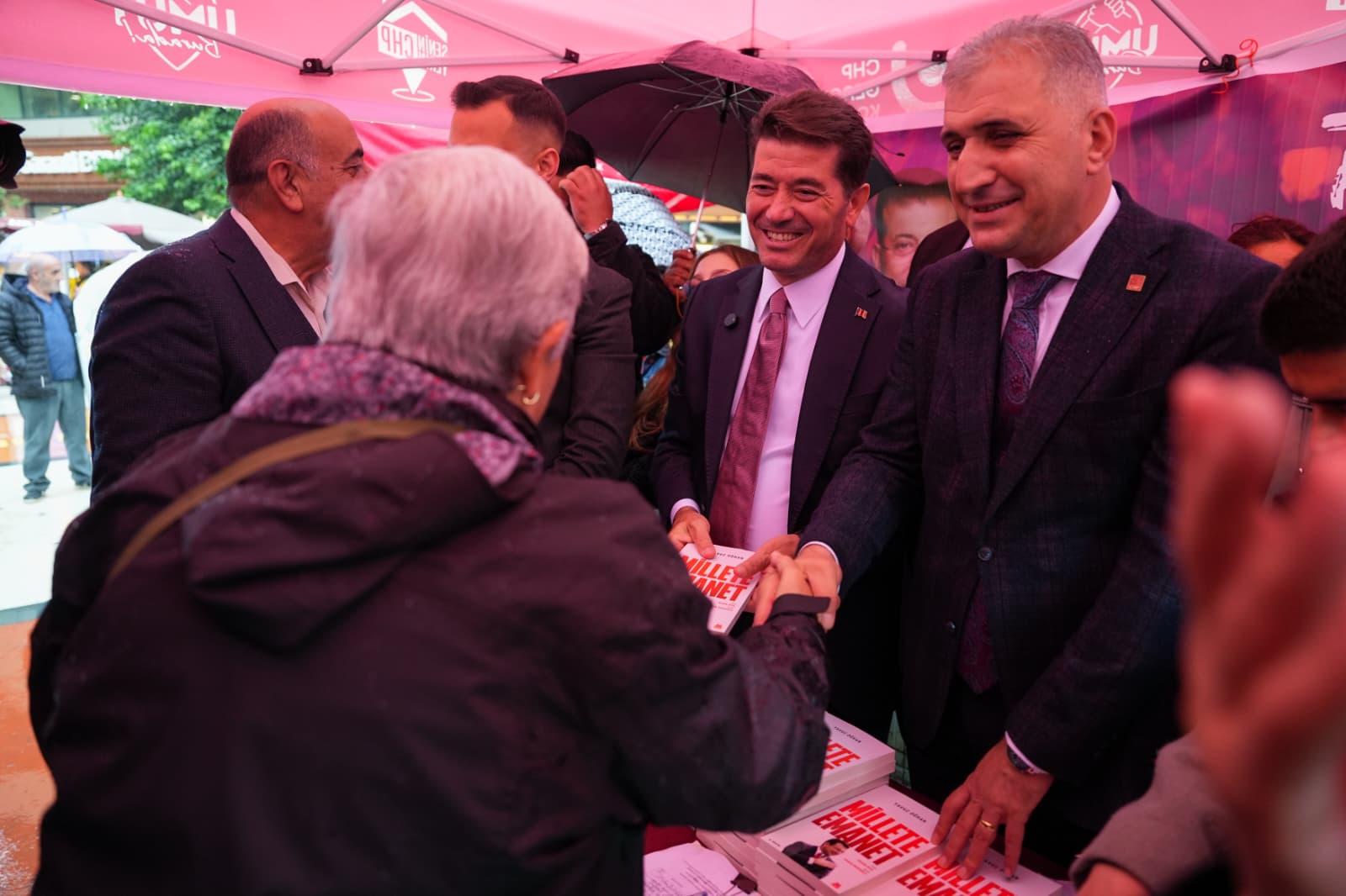 Yoğun yağışa rağmen ‘Millete Emanet’ adlı kitabın tanıtım ve satış etkinliğine katılanlara teşekkür ederek konuşmasına başlayan Başkan Kaya, “Hava yağmurlu ama adalet arayışının, dayanışmanın, mücadelenin yağmuru-çamuru, karı-kışı olmaz. Duyarlılık gösterdiniz, bu yağmura rağmen buraya geldiniz, bunun için hepinize çok teşekkür ediyorum. Bu çok kıymetli. Bizim bu mücadele ruhuna ihtiyacımız var. Arkadaşlarımız haksız ve hukuksuz bir şekilde cezaevlerinde, zindanlarda tutuluyor. Vicdanı olan, adalet arayan herkesin bu mücadeleye sahip çıkması ve destek olması lazım. Ben de bugün bu bilinçle buraya gelen herkese tekrar teşekkür ediyorum” dedi.