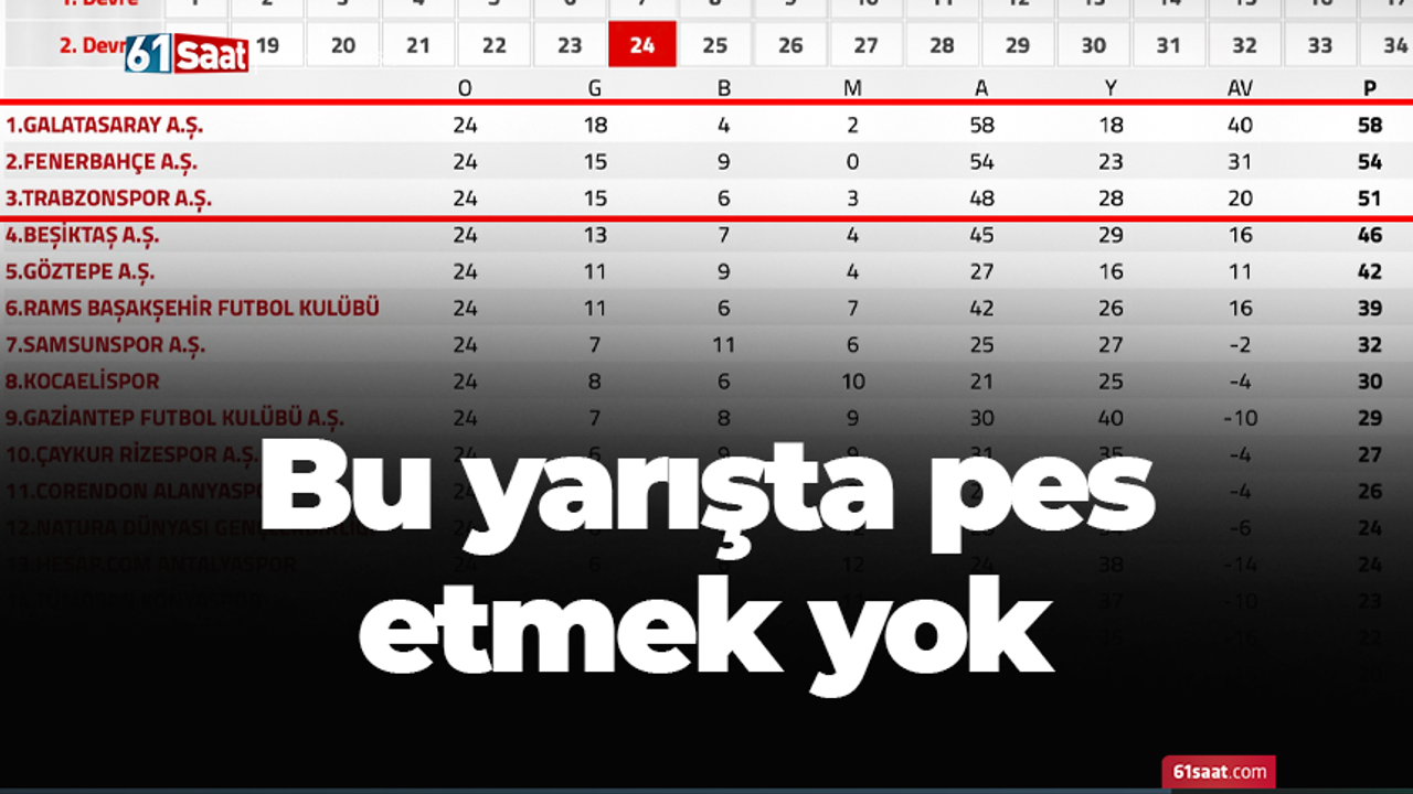 Çünkü önümüzdeki haftalar kader haftaları. Galatasaray Beşiktaş ile, Fenerbahçe ise Samsunspor ile karşılaşacak. Trabzonspor’un ise fikstür avantajı var. Son ana kadar bu mücadele devam etmeli. Bu yarışta pes etmek yok.