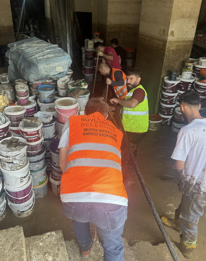 Geçtiğimiz günlerde Ortahisar ilçesinde etkili olan şiddetli yağışın neden olduğu sel ve su taşkınlarının ardından, ana cadde ve sokaklardaki temizlik çalışmalarını süratle tamamlayıp şehri bayrama hazır hale getiren Trabzon Büyükşehir Belediyesi, ev ve işyerleri su baskınına uğrayan vatandaşları da ilk andan itibaren yalnız bırakmadı. Bayramda da mesai yapan Büyükşehir ekipleri, Beşirli ve Pazarkapı'nın yanı sıra kırsaldaki bazı mahallelerde ev, işyeri ve bodrum katlarında temizlik çalışmaları yürüten vatandaşlara destek veriyor. Bu çalışmalarda, belediyenin farklı daire başkanlıklarından toplam 185 personel, 3 beko-loder, 2 lastikli ekskavatör, 3 paletli ekskavatör, 2 greyder, 1 loder, 1 bobket, 2 sal kasa, 8 kamyon, 4 faun, 3 vidanjör, 2 vaktör, 3 su tankeri ve 1 kamyonet ile diğer ekipmanlardan oluşan toplam 57 araçla görev yapıyor. Bodrum katlar ve depolar boşaltılıp su taşkınlarından arta kalan çamur temizlenirken, esnafın zarar görmemiş ürünlerinin yıkanması da sağlanıyor.