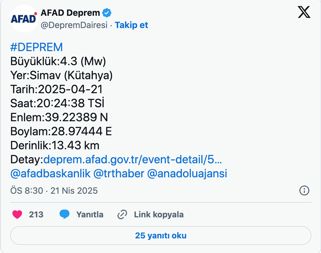 AFAD'ın verilerine göre; saat 20:24'te Kütahya'nın Simav ilçesinde 4,3 büyüklüğünde deprem meydana geldi.