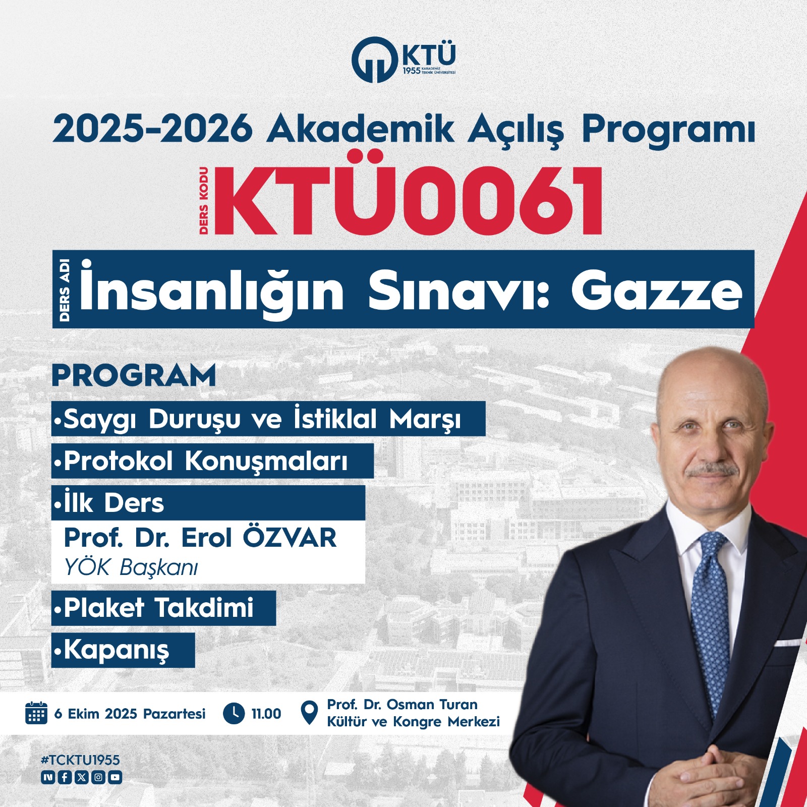 Programın en can alıcı noktası ise "KTÜ0061" ders koduyla ilan edilen ve YÖK Başkanı Prof. Dr. Erol Özvar'ın sunumuyla gerçekleşecek olan "İnsanlığın Sınavı: Gazze" başlıklı ilk ders olacak. Akademik yılın başlangıcında böyle hassas ve küresel bir konunun seçilmesi, üniversitenin insani krizlere karşı duyarlılığını ve toplumsal farkındalık yaratma misyonunu bir kez daha gözler önüne serdi.