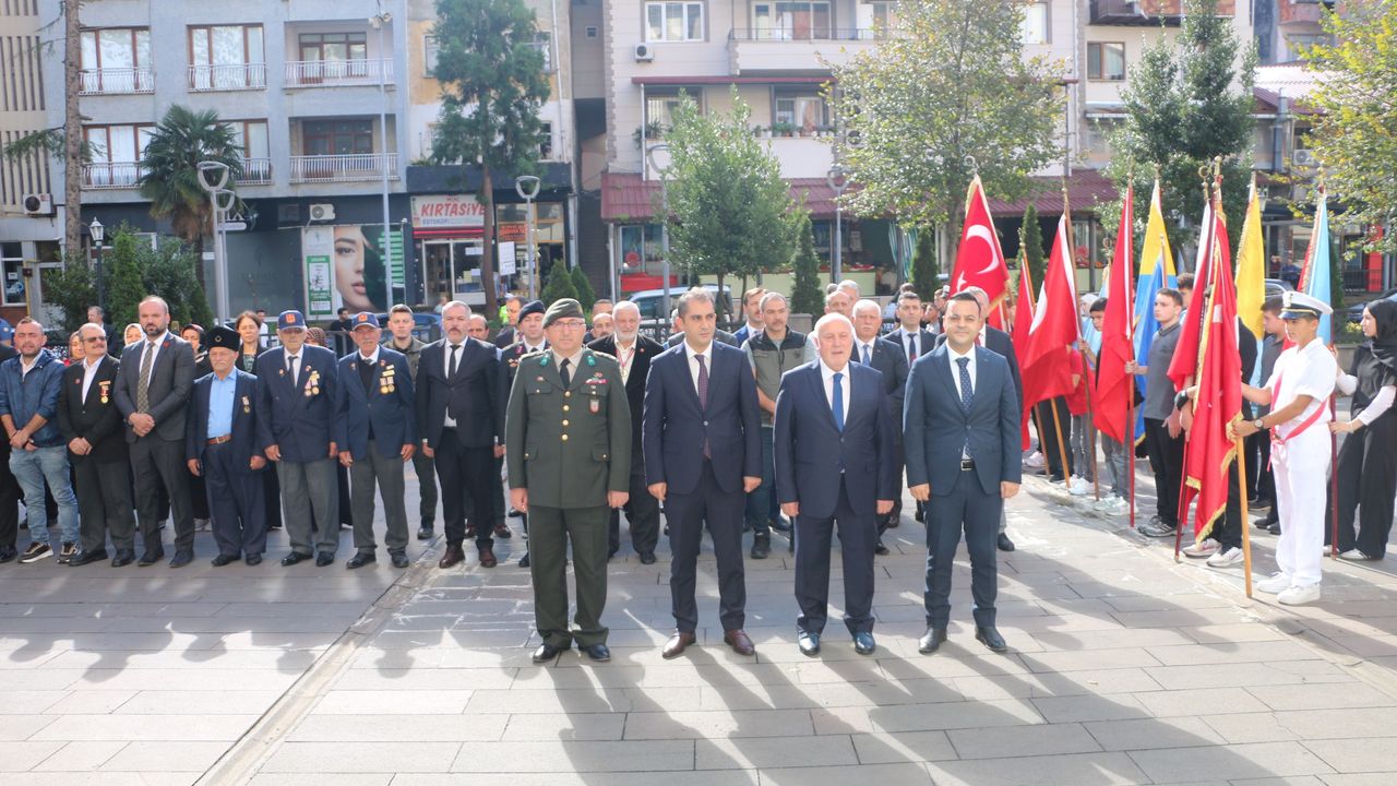 Of Kaymakamlığı önündeki Atatürk büstüne çelenk sunulmasının ardından saygı duruşunda bulunuldu, İstiklal Marşı okundu.