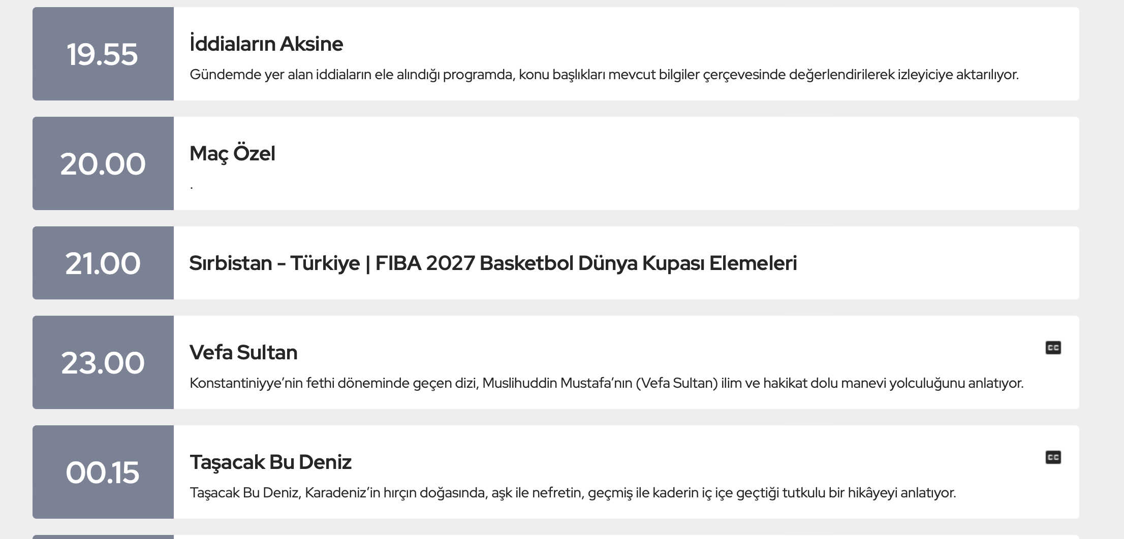 Çekimleri Trabzon'un birçok noktasında devam eden ve yayınlandığı günden itibaren reyting rekorları kıran Taşacak Bu Deniz'in 20.bölümünü bekleyen izleyiciler üzen haberi aldı. Bu akşam yeni bölümüyle ekranlara gelmesi planlanan Taşacak Bu Deniz, TRT’nin yayın akışında yer almadı. Yayın akışına FIBA 2027 Dünya Kupası Avrupa Elemeleri 1. Tur C Grubu’nda A Milli Erkek Basketbol Takımı’nın Sırbistan ile karşılaşacağı müsabaka eklendi. Kanal ve yapımdan henüz resmi bir açıklama yapılmazken yayın akışından çıkarılan Taşacak Bu Deniz'in bu akşam yeni bölümünün ekranlara gelme ihtimali de zayıfladı. 00.15'te Taşacak Bu Deniz'in 19.bölüm tekrarı ile ekranlara gelmesi bekleniyor.