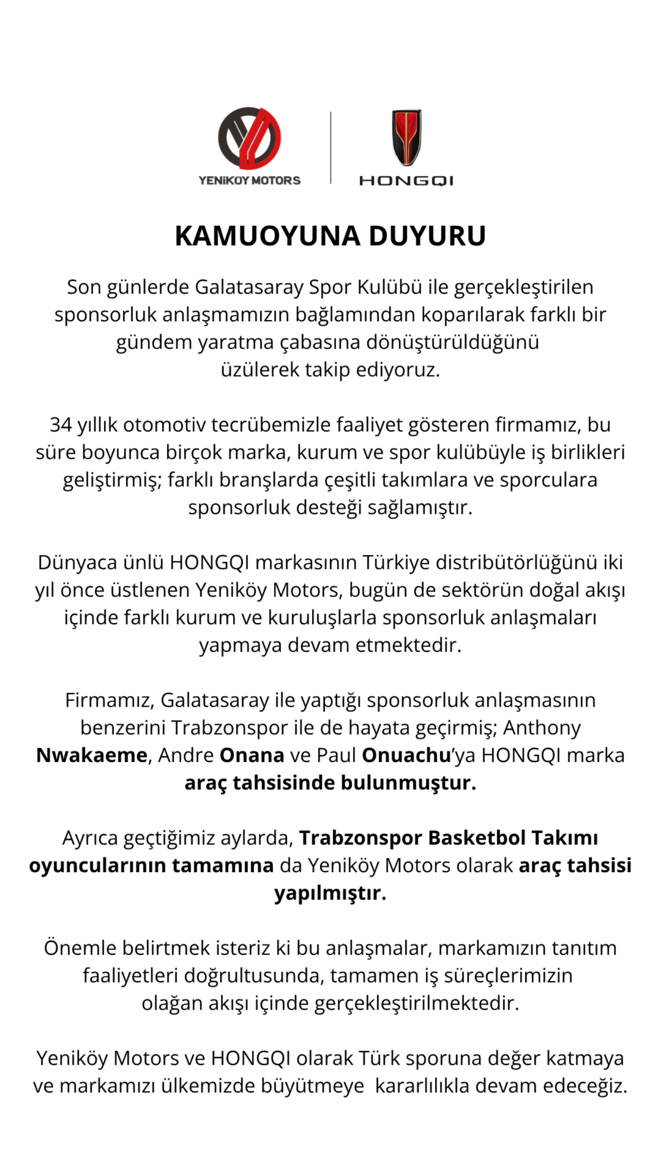 Yeniköy Motors'tan Galatasaray ile imzalanan anlaşma sonrası Trabzonspor taraftarlarının tepki seslerinin yükselmesi sonrası yapılan açıklamada şu ifadelere yer verildi: