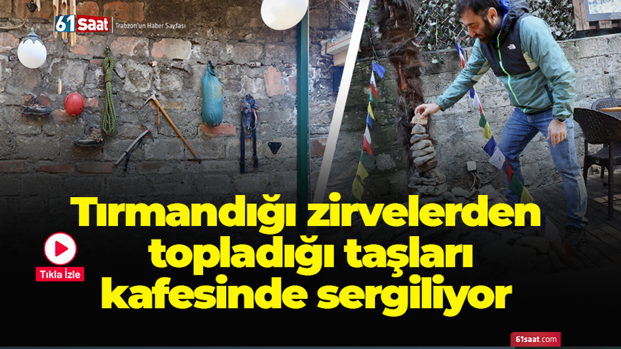 Sonbay, kent merkezinde 12 yıl önce açtığı kafede, tırmandığı zirvelerden topladığı taşların yanı sıra dağcı arkadaşlarına ait tırmanış malzemelerini de sergileyerek müşterilerinin ilgisini çekiyor.