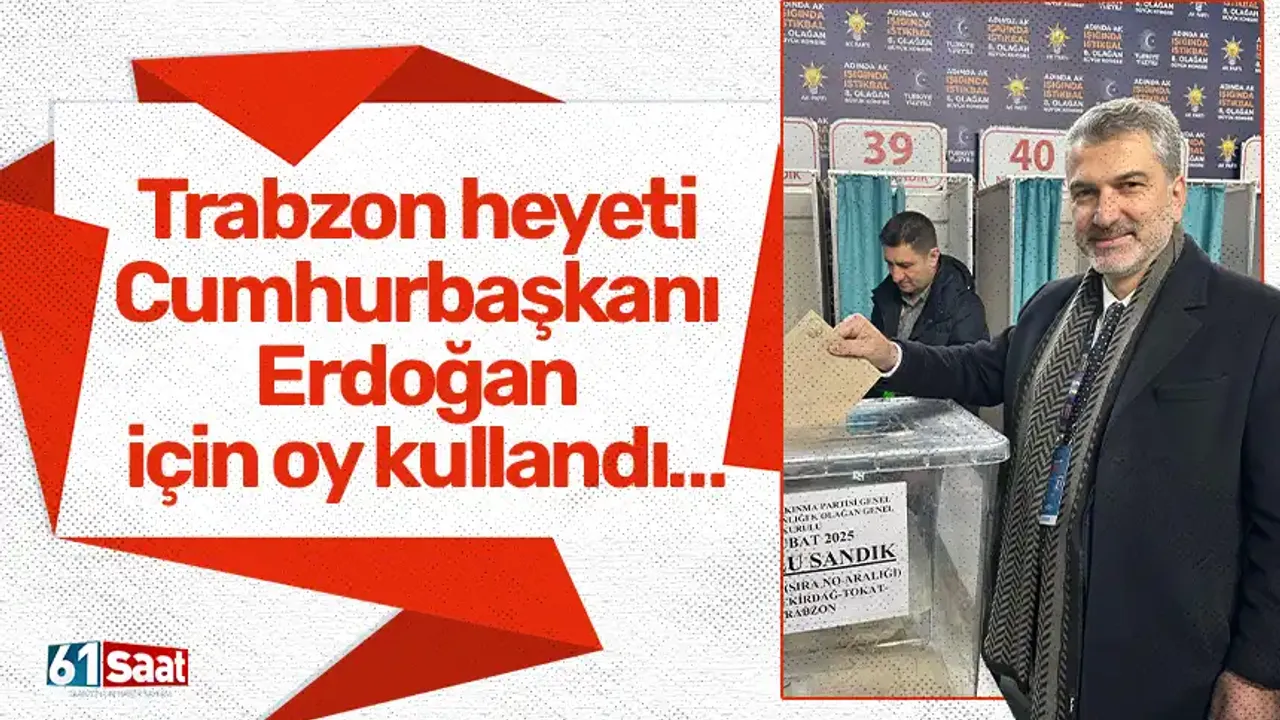 AK Parti Trabzon İl Başkanı Dr. Sezgin Mumcu ve İl kadın kolları başkanı Ayfer Cihan, İl Gençlik Kolları Başkanı Mahmut Çavuş, Trabzon Büyükşehir Belediye Başkanı Ahmet Metin Genç, Faruk Nafiz Özak, Mehmet Cahit Turan, Furkan Topaloğlu, Nesrin Semiz, Seyit Hisoğlu, Muhammet Ali Yılmaz, Osman Nuri Ekim, Ahmet Serdan, Aydoğan İskender ve Osman Baykal büyük kongre delegeleri olarak Cumhurbaşkanı Erdoğan’ı yeniden AK Parti Genel Başkanı olarak seçmek için oy kullandılar.