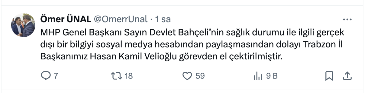 Ünal açıklamasında, “MHP Genel Başkanı Sayın Devlet Bahçeli’nin sağlık durumu ile ilgili gerçek dışı bir bilgiyi sosyal medya hesabından paylaşmasından dolayı Trabzon İl Başkanımız Hasan Kamil Velioğlu görevden el çektirilmiştir” ifadelerine yer verdi.