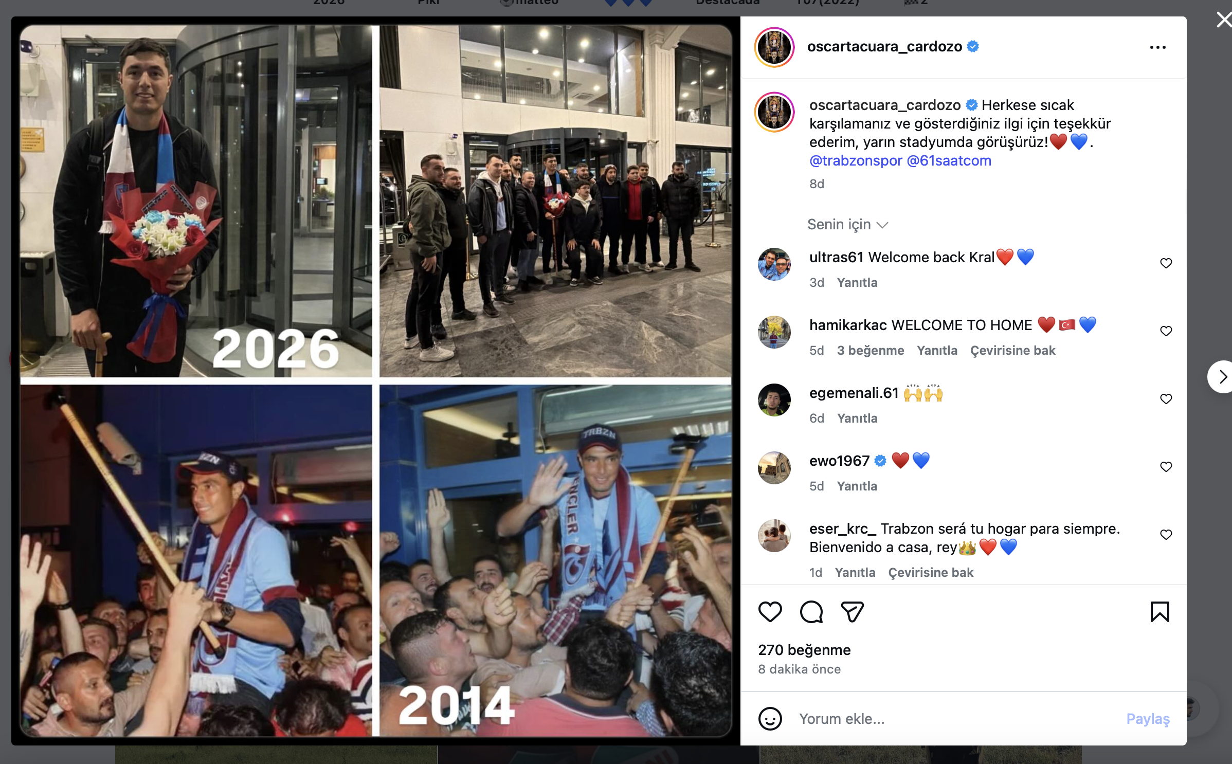 Trabzon’a gelen Oscar Cardozo açıklamasında, “Sıcak karşılamanız nedeniyle hepinize teşekkür ediyorum. Yarın stadyumda görüşürüz” diyerek bordo mavili taraftarları da stadyuma davet etti.