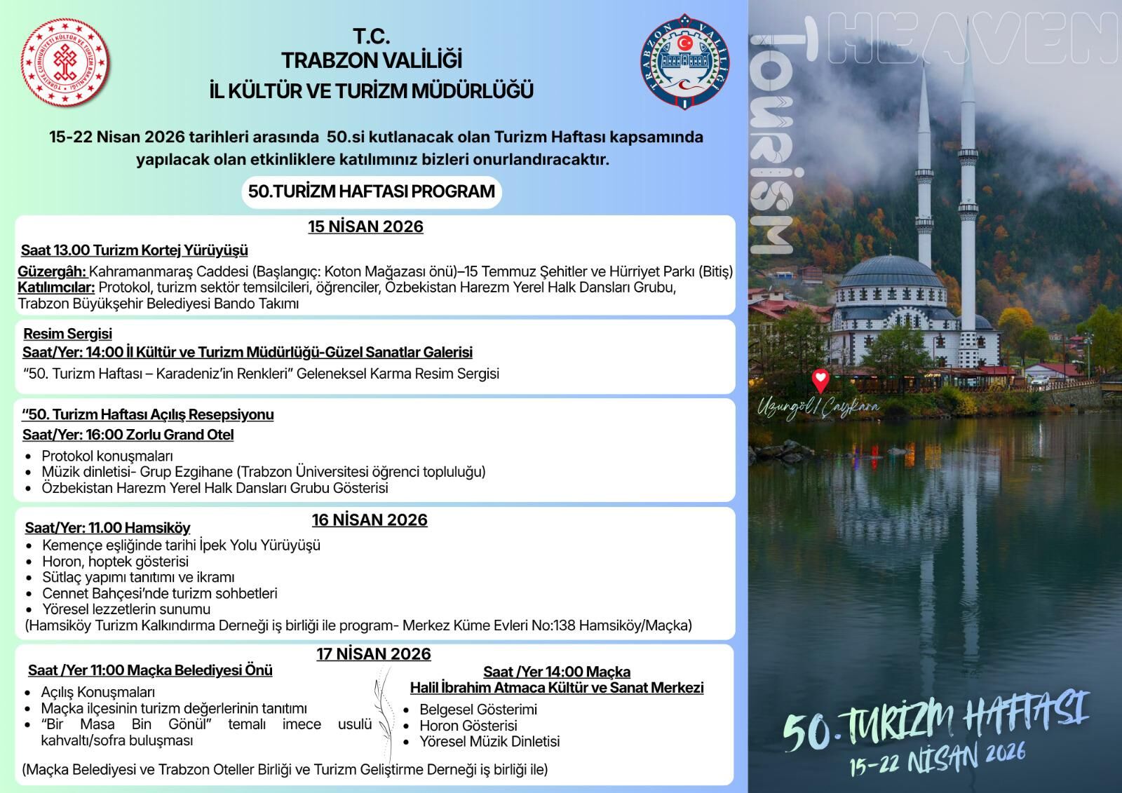 Trabzon’da turizm bilincini artırmayı hedefleyen 50. Turizm Haftası etkinliklerine yoğun katılım bekleniyor.