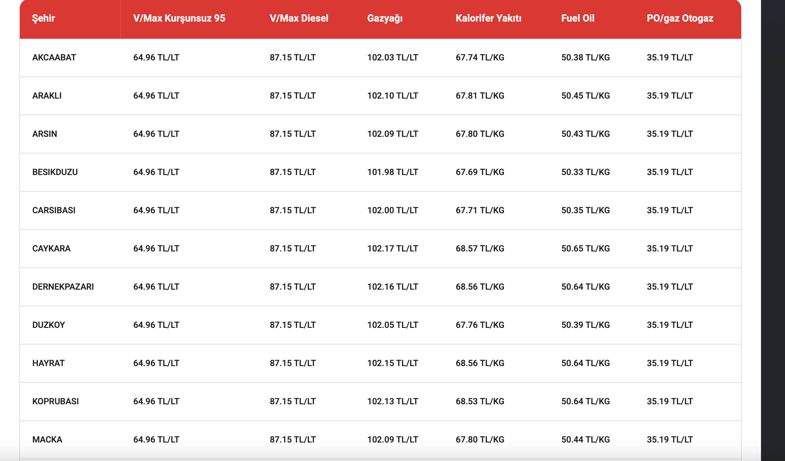 Açıklanan tabloya göre, Trabzon’un tüm ilçelerinde V/Max kurşunsuz 95 litre fiyatı 64.96 TL olarak uygulanırken, motorin (V/Max Diesel) fiyatı da 87.15 TL seviyesinde sabit kaldı. Otogaz fiyatı ise yine tüm ilçelerde 35.19 TL/LT olarak belirlendi. Öte yandan gazyağı, kalorifer yakıtı ve fuel oil fiyatlarında ise ilçe bazlı küçük farklılıklar oluştu. Gazyağı fiyatı en düşük 101.98 TL ile Beşikdüzü’nde görülürken, en yüksek 102.17 TL ile Çaykara’da kaydedildi.