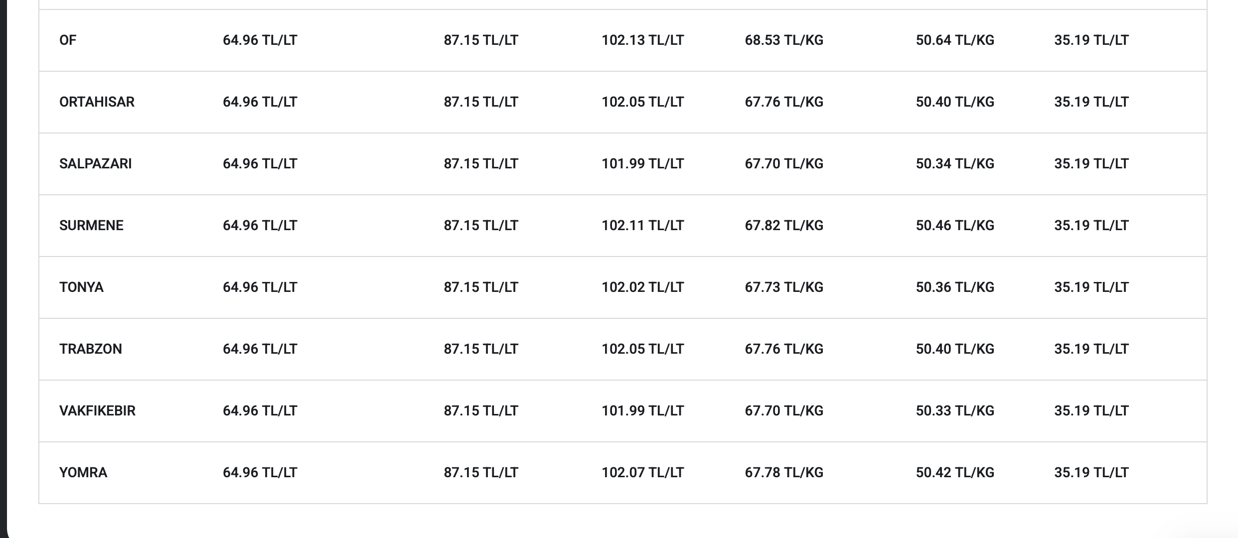 Kalorifer yakıtında da benzer bir tablo ortaya çıktı. En düşük fiyat 67.69 TL/KG ile Beşikdüzü’nde ölçülürken, en yüksek fiyat 68.57 TL/KG ile yine Çaykara’da belirlendi. Fuel oil fiyatları da ilçelere göre küçük değişimler gösterdi. En düşük 50.33 TL/KG ile Beşikdüzü ve Vakfıkebir’de görülürken, en yüksek fiyat 50.65 TL/KG ile Çaykara’da kaydedildi. Ortaya çıkan tablo, Trabzon genelinde akaryakıt fiyatlarının büyük ölçüde dengede olduğunu gösterirken, özellikle ısınma ve sanayi kullanımında tercih edilen ürünlerde ilçeler arasında sınırlı da olsa fiyat farklarının oluştuğunu ortaya koydu.