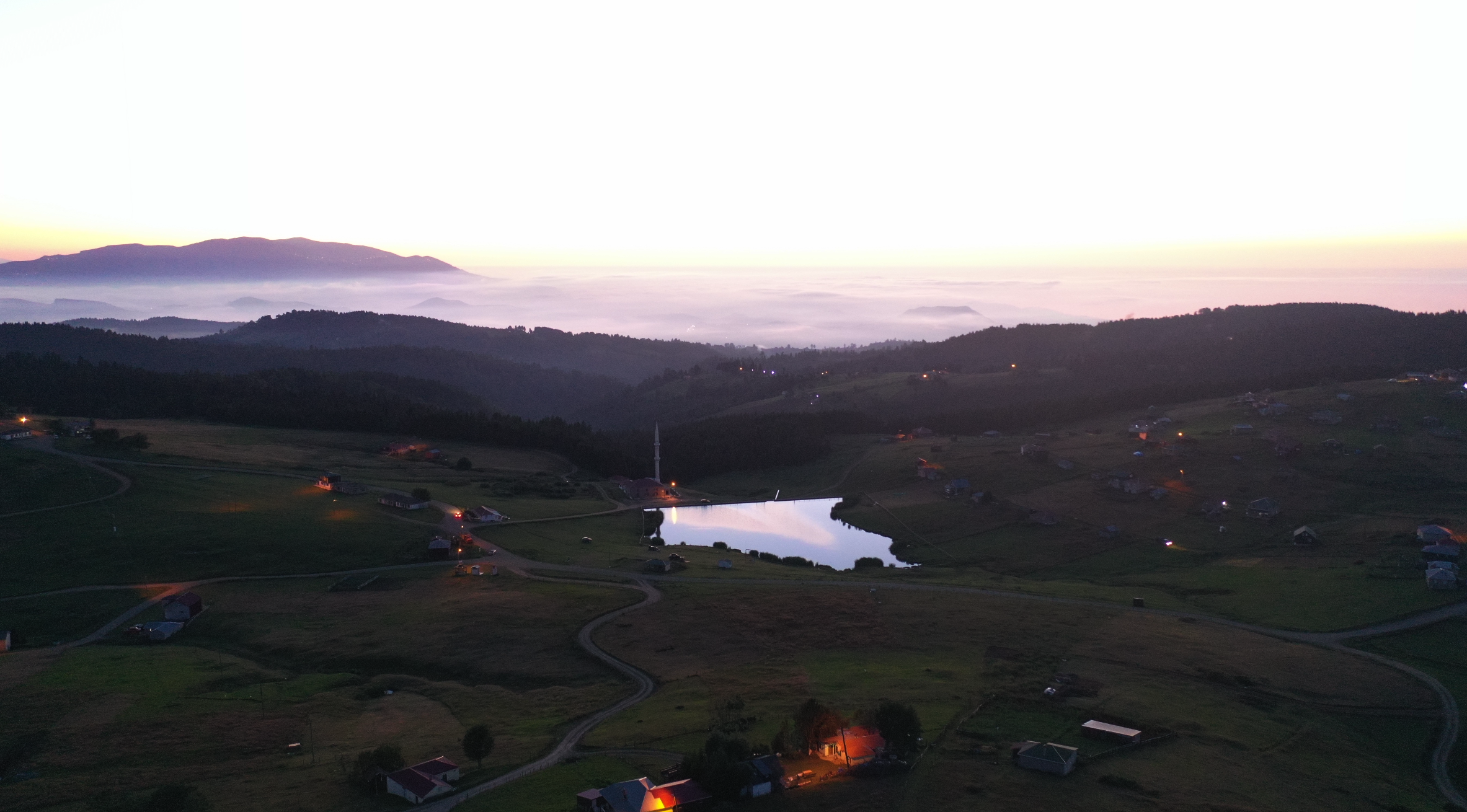 Trabzon'un Düzköy ilçesindeki Hırsafa Yaylası'nda gün batımında oluşan manzara drone ile görüntülendi.