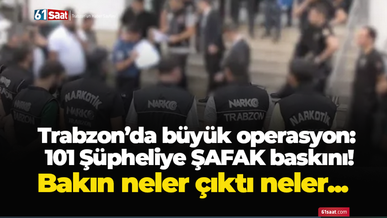 Cumhuriyet Başsavcılığımızın talimatı doğrultusunda Trabzon İl Emniyet Müdürlüğü Narkotik Suçlarla Mücadele Şube Müdürlüğünce yürütülen ayrıntılı çalışmalar sonucunda; Trabzon il merkezi ve 17 ilçesi ile ilimizle bağlantılı olarak Artvin, Adıyaman, Hakkari ve İzmir illerinde uyuşturucu veya uyarıcı madde ticareti yaptığı somut delillerle tespit edilen 101 şüpheliye yönelik suç delillerinin elde edilmesi ve şüphelilerin yakalanarak gözaltına alınması amacıyla 07.04.2026 tarihinde saat 06.30 sıralarında Trabzon merkezli toplam 5 ilde arama, el koyma ve gözaltı işlemi yapılmasına, ayrıca bu soruşturmalar sürecinde ara yakalamalarda uyuşturucu veya uyarıcı madde kullandığı tespit edilen 175 şüpheli hakkında ise ifadelerini almak üzere yakalama ve telefonları ile dijital materyallerine el konulmasına karar verilmiştir.