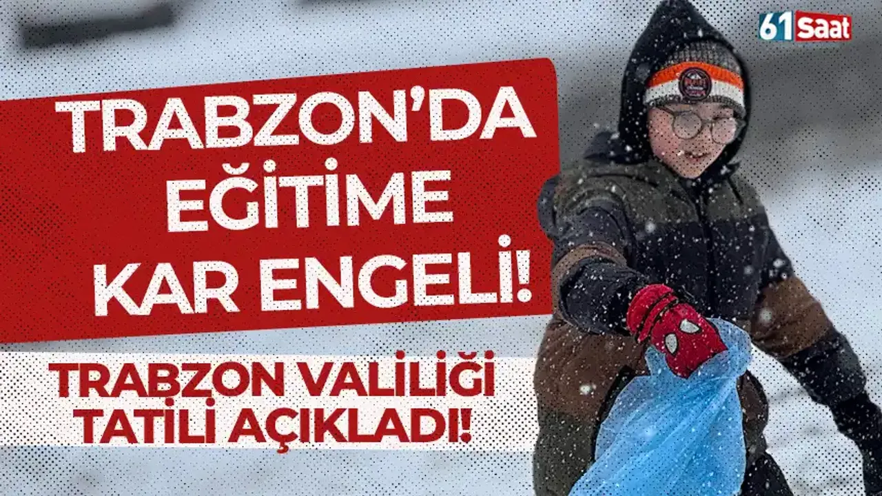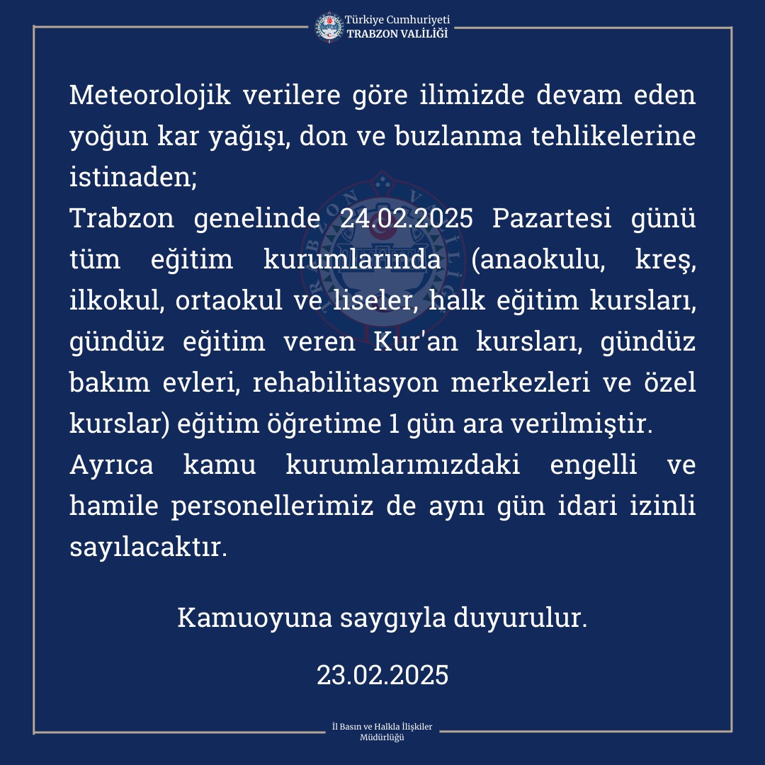 Trabzon genelinde 24.02.2025 Pazartesi günü tüm eğitim kurumlarında (anaokulu, kreş, ilkokul, ortaokul ve liseler, halk eğitim kursları, gündüz eğitim veren Kur'an kursları, gündüz bakım evleri, rehabilitasyon merkezleri ve özel kurslar) eğitim öğretime 1 gün ara verilmiştir. Ayrıca kamu kurumlarımızdaki engelli ve hamile personellerimiz de aynı gün idari izinli sayılacaktır." ifadeleri kullanıldı.