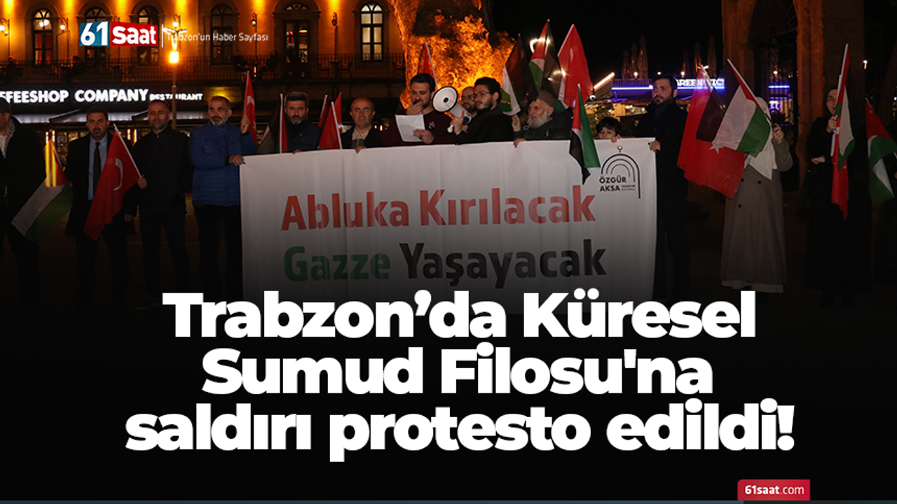 Trabzon'da İskender Paşa Camisi önünde bir araya gelen Özgür Aksa Trabzon Platformu üyeleri adına açıklama yapan Furkan Çelik, Akdeniz'in dalgalarının sadece Sumud Filosu'nun teknelerini değil, umudu ve mücadeleyi taşıdığını vurguladı.