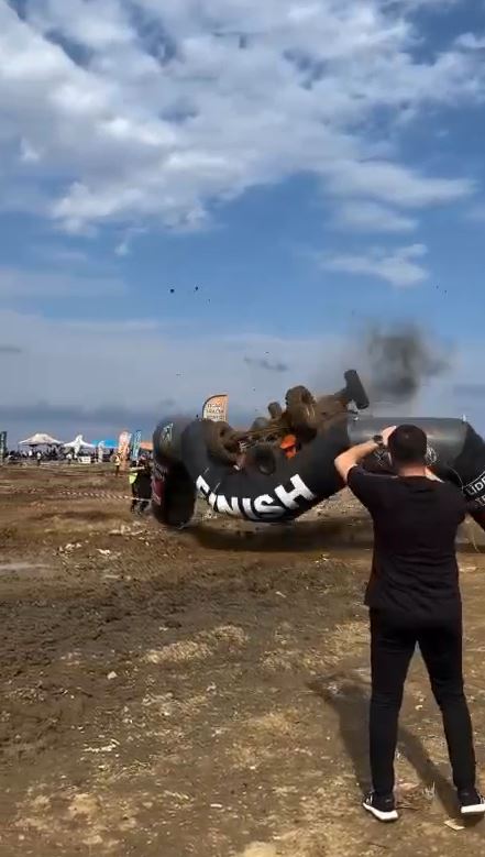 Yarışların son bölümünde ekipte yer alan bir off-road aracının taklalar atıp, bitiş balonunu devirdiği anlar, kameraya yansıdı. Görüntülerde, parkurda uçarak havalanan aracın takla atarak bitiş balonuna çarptığı, kazayı yara almadan atlanan sürücünün de aracından inerek yanına gelen ekip arkadaşlarıyla coşku yaşadığı anlar yer aldı.