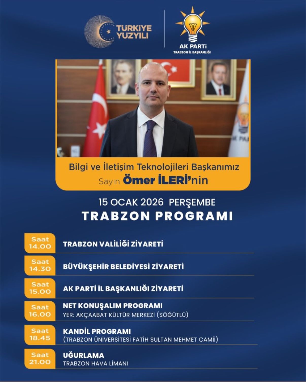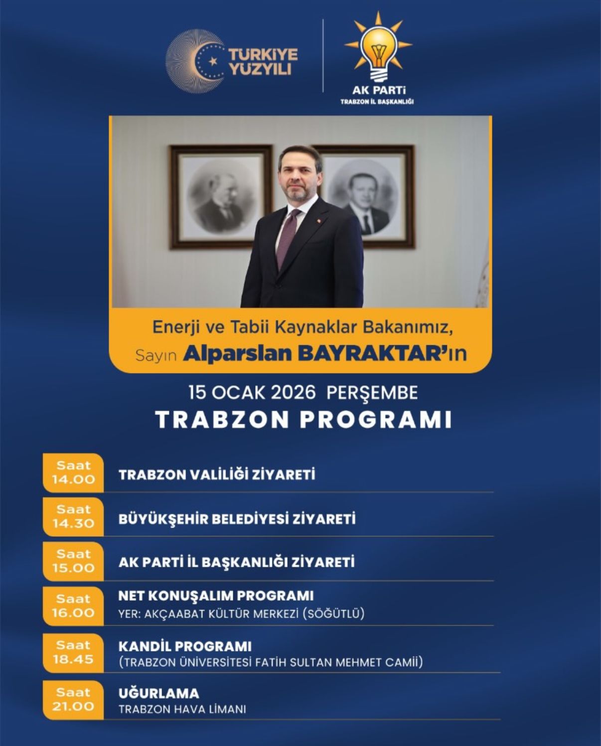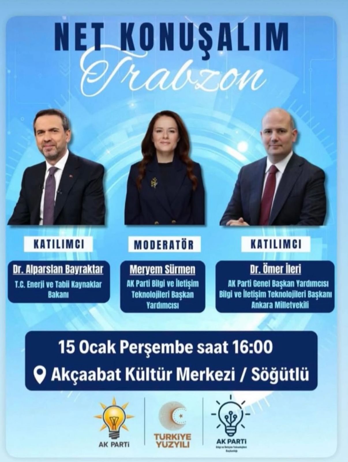 Enerji ve Tabii Kaynaklar Bakanı Alparslan Bayraktar ile AK Parti Genel Başkan Yardımcısı, Bilgi ve İletişim Teknolojileri Başkanı ve Ankara Milletvekili Ömer İleri’nin katılımıyla gerçekleştirilecek “Net Konuşalım Trabzon” programında, gençlerle bir araya gelinerek Türkiye Yüzyılı vizyonu, enerji, teknoloji ve iletişim alanlarındaki çalışmalar ele alınacak.
