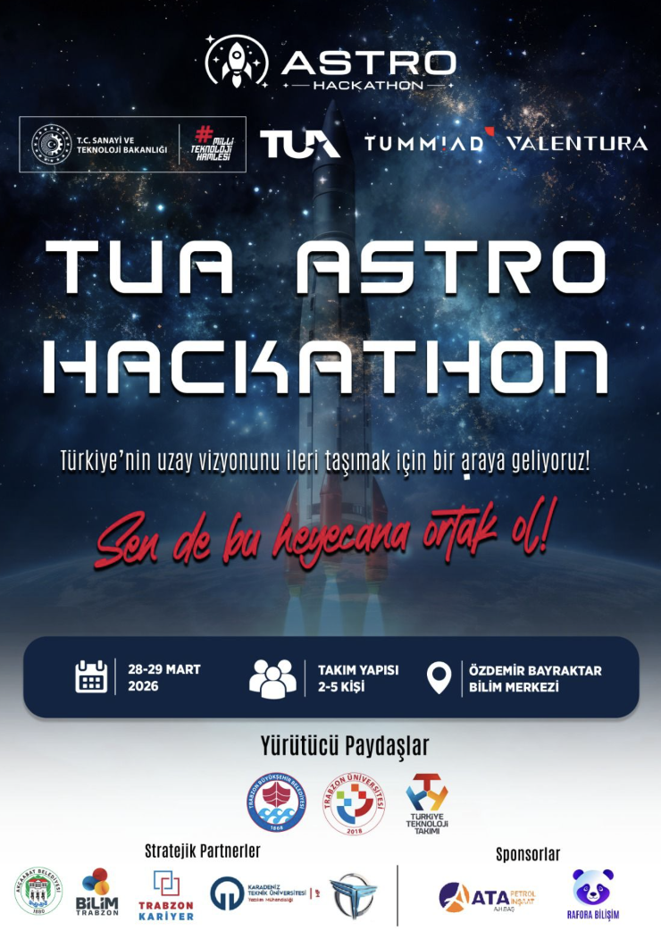 Gençlerin yenilikçi fikirlerini desteklemek ve teknoloji üretim ekosistemini geliştirmek amacıyla düzenlenen TUA Astro Hackathon, 28-29 Mart 2026 tarihlerinde gerçekleştirilecek.