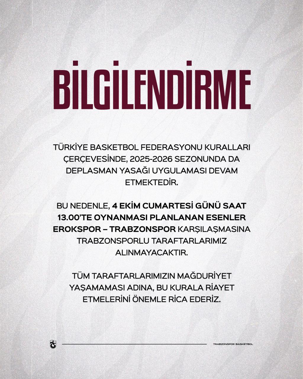 Trabzonspor'un açıklamasında, "Türkiye Basketbol Federasyonu kuralları çerçevesinde, 2025-2026 sezonunda da deplasman yasağı uygulaması devam etmektedir. Bu nedenle, 4 Ekim Cumartesi günü saat 13.00’te oynanması planlanan Esenler Erokspor – Trabzonspor karşılaşmasına Trabzonsporlu taraftarlarımız alınmayacaktır. Tüm taraftarlarımızın mağduriyet yaşamaması adına, bu kurala riayet etmelerini önemle rica ederiz" ifadelerine yer verildi.