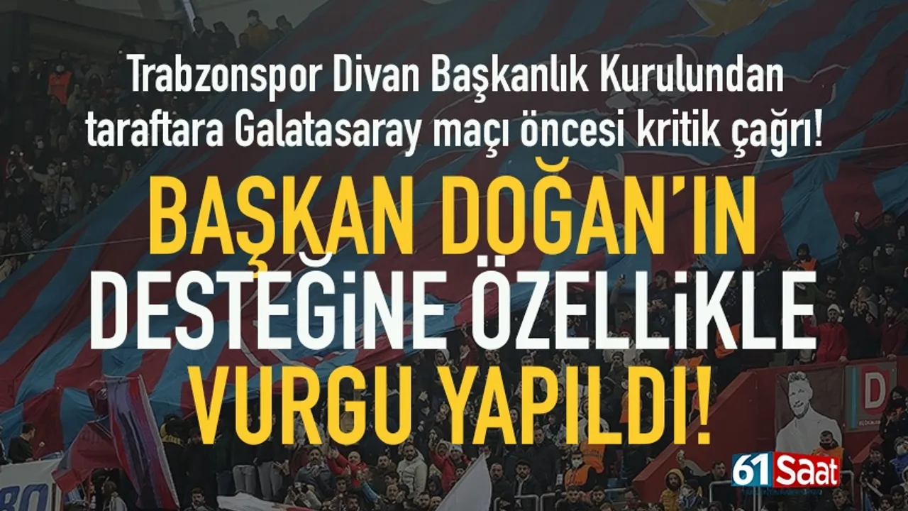 Yapılan açıklamada Trabzonspor taraftarlarının sağduyuyla hareket etmeye ve bilik içerisinde ortak değerleri öncelemeye davet edildiği kaydedilerek, “4 Nisan Cumartesi günü oynayacağımız Galatasaray karşılaşması; camiamız açısından sağduyunun, birlik bilincinin ve Trabzonspor ruhunun en güçlü şekilde ortaya konulması gereken bir gündür. Önemli maçların arifesinde, duyguların yoğunluğu çoğu zaman aklın önüne geçebilir. Bu doğrultuda tüm camiamızı, sağduyuyla hareket etmeye ve birlik içerisinde ortak değerlerimizi öncelemeye davet ediyoruz.