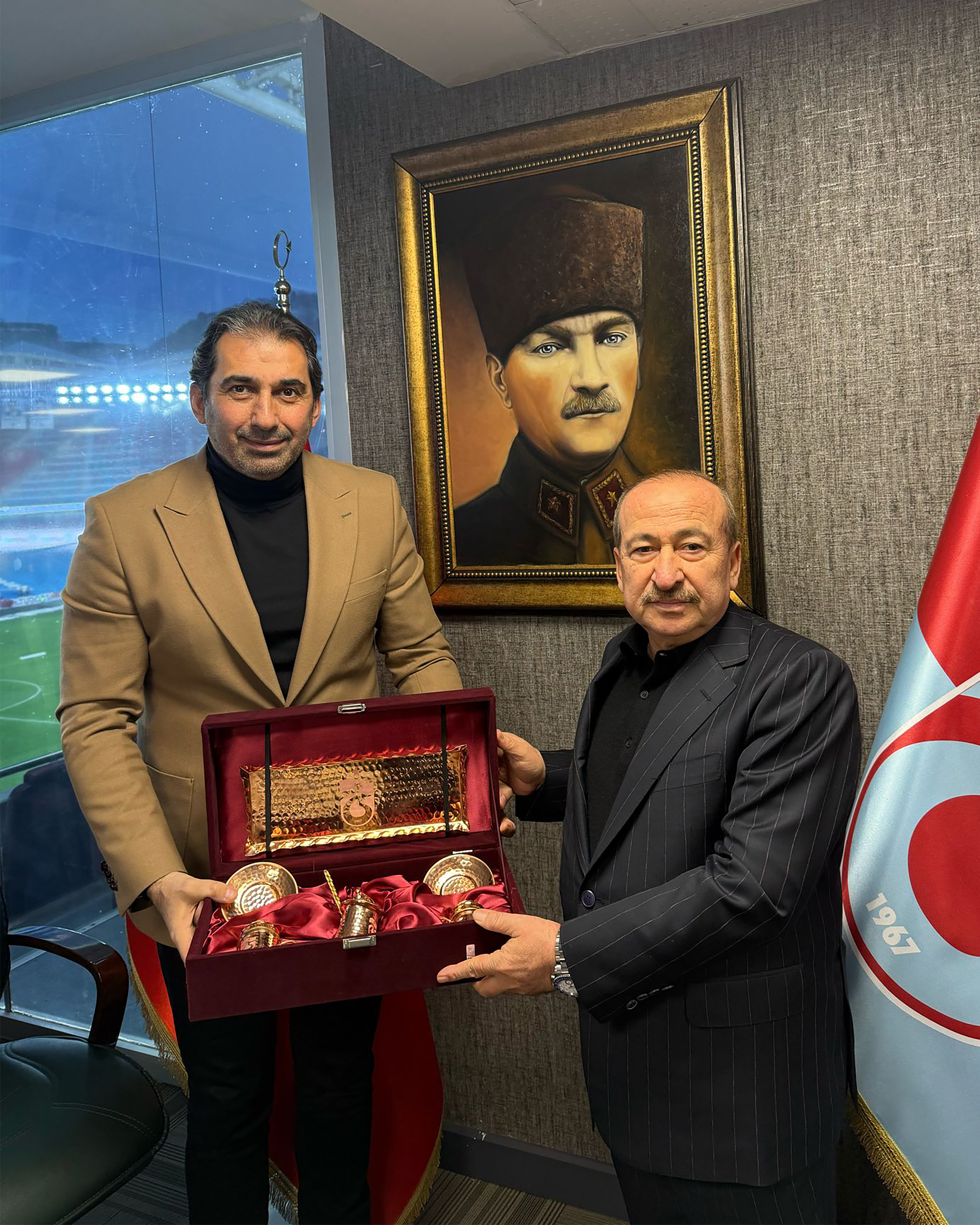Asbaşkan Zeyyat Kafkas tarafından Gaziantep FK Başkanı Memik Yılmaz’a günün anısına bakır fincan takımı hediye edildi.