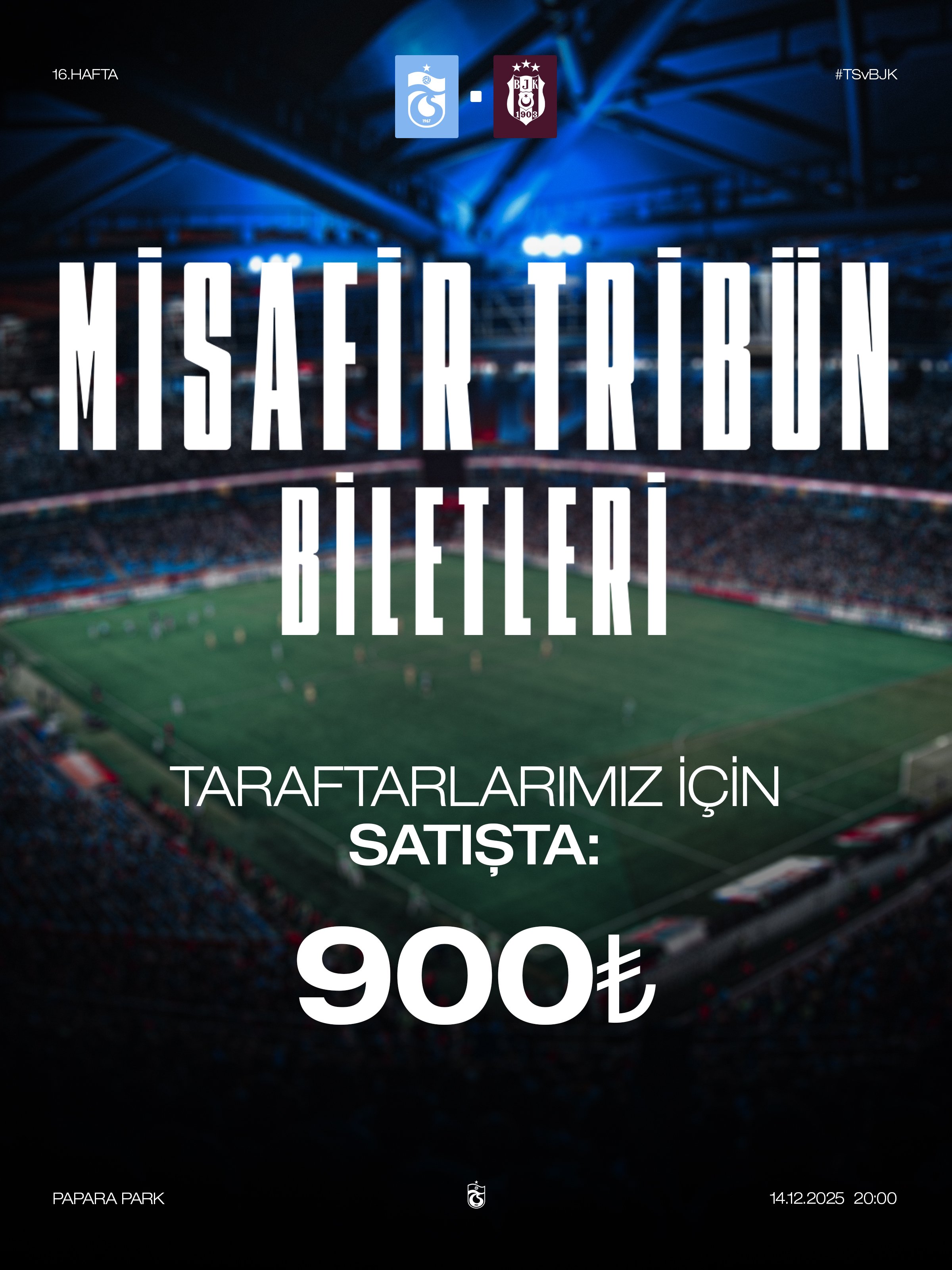 Trabzonspor'da biletlerin tamamının tükenmesi sonrası misafir tribün biletleri de satışa çıktı. Bordo mavili kulüpten yapılan açıklamada, "Takımımızın 14 Aralık Pazar saat 20.00’de oynayacağı Beşiktaş maçı biletleri tükenmiş ve misafir tribün biletleri taraftarlarımız için satışa sunulmuştur. İl Güvenlik Kurulu kararı gereğince rakip takım seyircisinin alınmayacağı misafir tribün biletlerinin fiyatı 900 TL olarak belirlenmiştir" ifadelerine yer verildi.