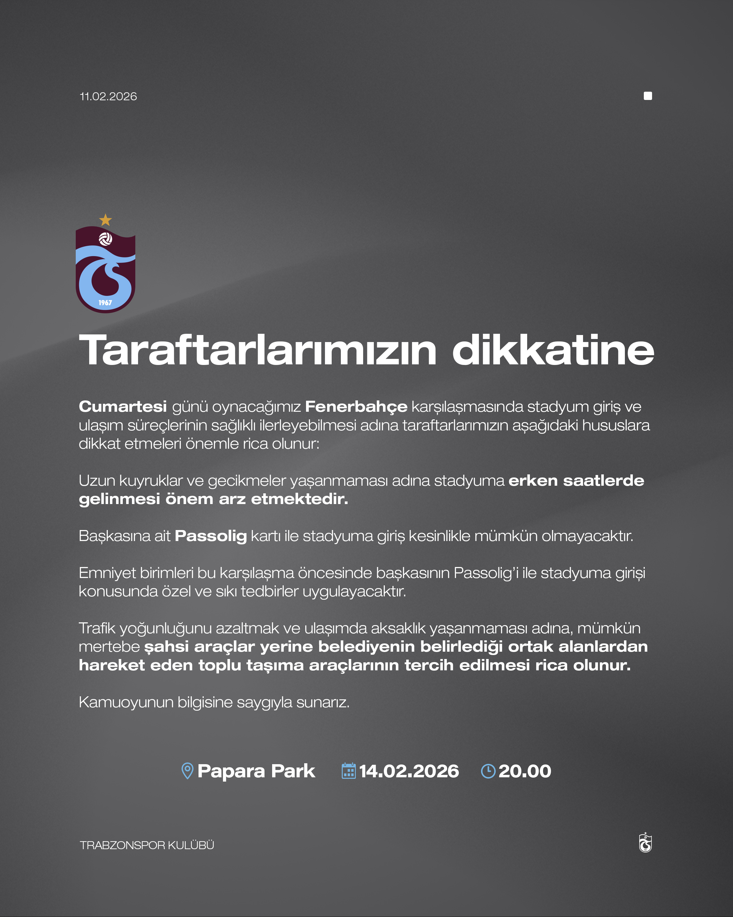 "Uzun kuyruklar ve gecikmeler yaşanmaması adına stadyuma erken saatlerde gelinmesi önem arz etmektedir. Başkasına ait Passolig kartı ile stadyuma giriş kesinlikle mümkün olmayacaktır. Emniyet birimleri bu karşılaşma öncesinde başkasının Passolig'i ile stadyuma girişi konusunda özel ve sıkı tedbirler uygulayacaktır. Trafik yoğunluğunu azaltmak ve ulaşımda aksaklık yaşanmaması adına mümkün mertebe şahsi araçlar yerine belediyenin belirlediği ortak alanlardan hareket eden toplu taşıma araçlarının tercih edilmesi rica olunur."