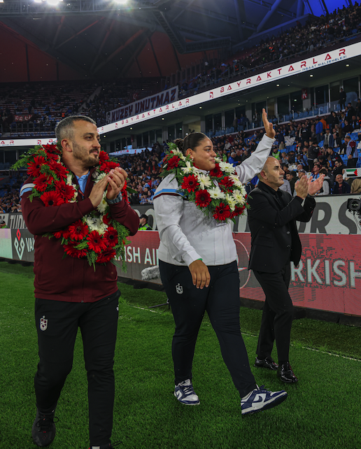 Çiçek takdiminin ardından Havvanur Kethüda, antrenörü Muhammet Çat ile birlikte Papara Park’ta tüm tribünleri dolaşarak taraftarları selamladı.