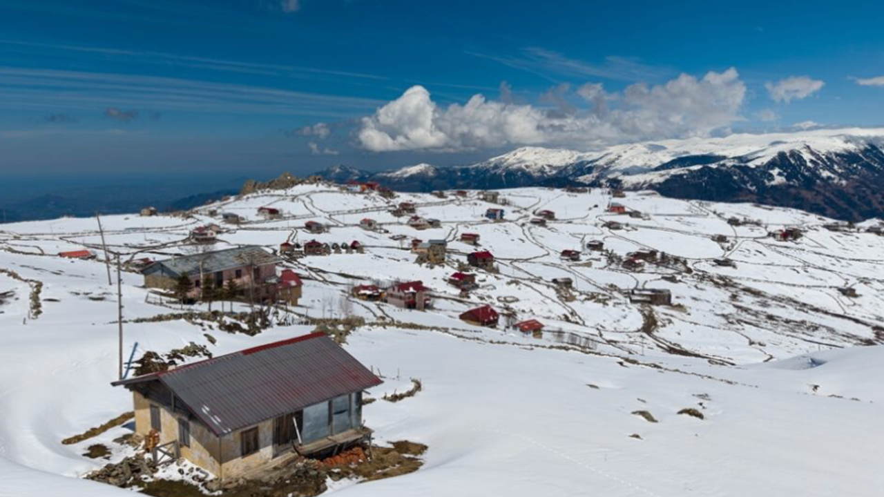 Karla kaplı yayla evleri ve yaylanın zirveleri dronla kaydedildi.