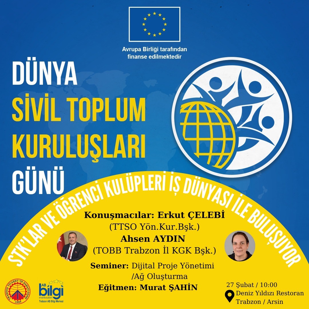 TTSO Trabzon Avrupa Birliği Bilgi Merkezi, Dünya Sivil Toplum Gününü kutlamak amacıyla “STK’lar ve öğrenci kulüpleri İş Dünyası ile Buluşuyor” etkinliğini düzenleyerek yerel sivil toplum kuruluşları ile bir araya geliyor.