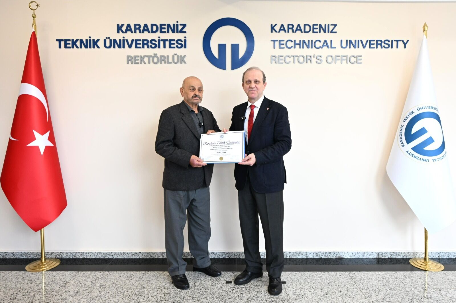 Ziyaret, KTÜ Rektörü Prof. Dr. Çuvalcı’nın misafirine, temsili diploma ve rozet takdimi ile hatıra fotoğrafı çektirilmesinin ardından sona erdi.
