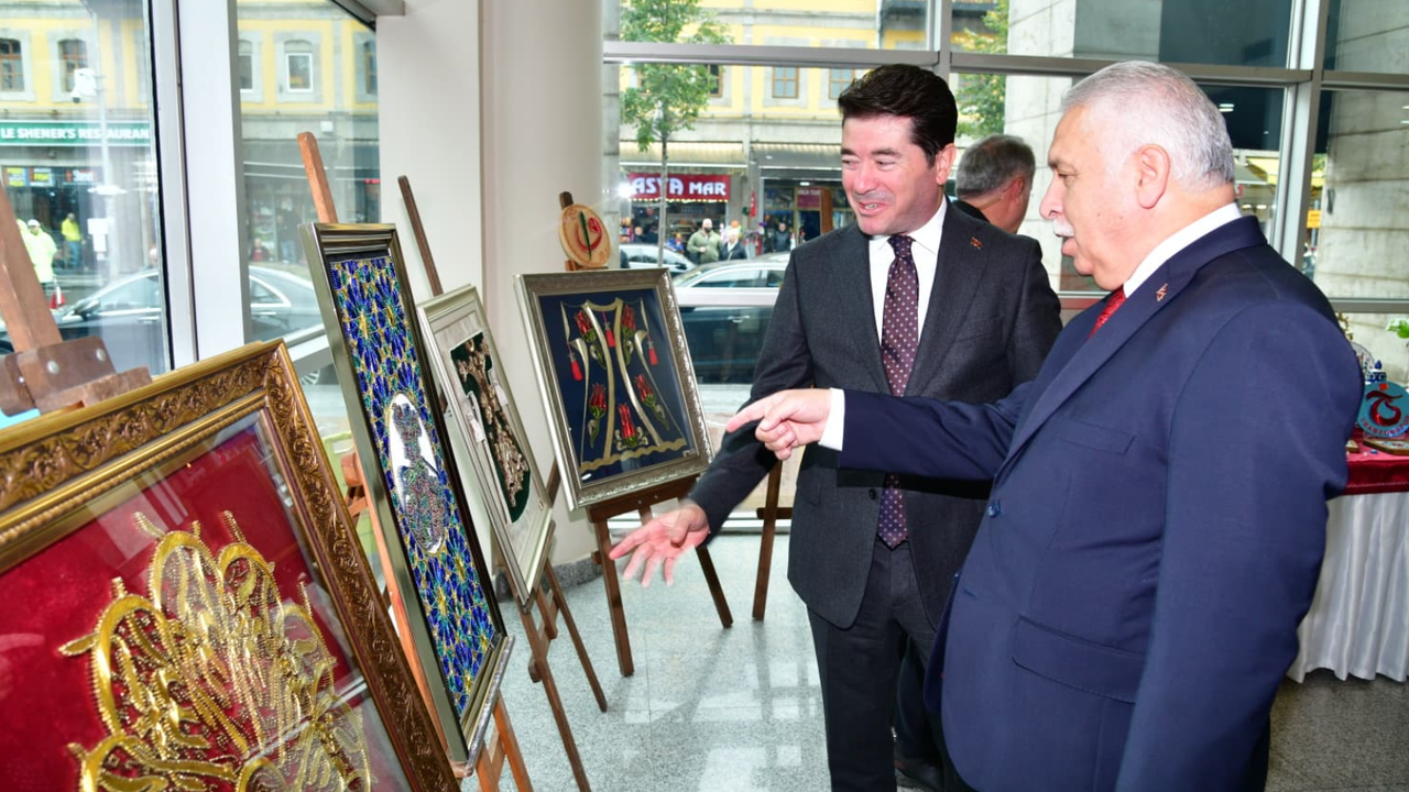 Sergiyi ziyaret eden Trabzon Valisi Aziz Yıldırım, eserleri tek tek inceleyerek sanatçılardan çalışmalar hakkında bilgi aldı.