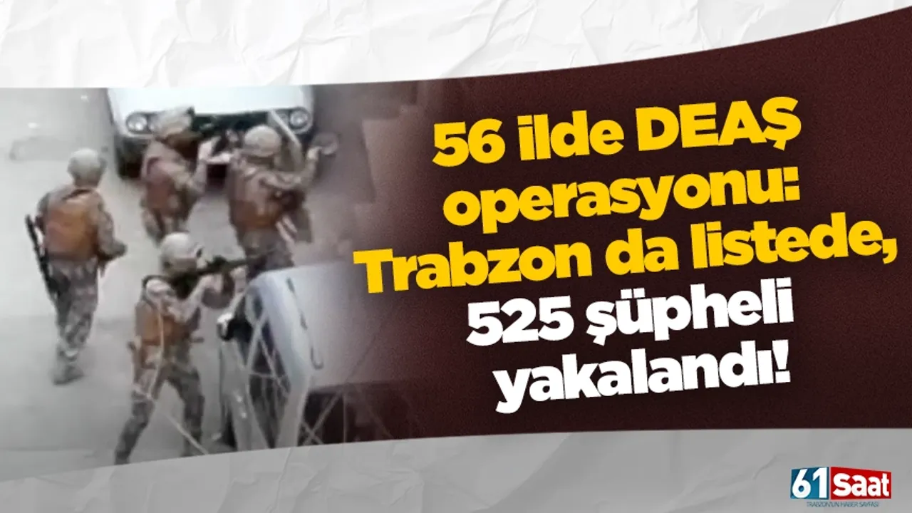 İçişleri Bakanlığı'ndan yapılan açıklamaya göre 56 ilde DEAŞ terör örgütüne yönelik düzenlenen operasyonlarda 525 şüpheli yakalandı. Operasyonların yürütüldüğü iller arasında Trabzon da yer aldı.
