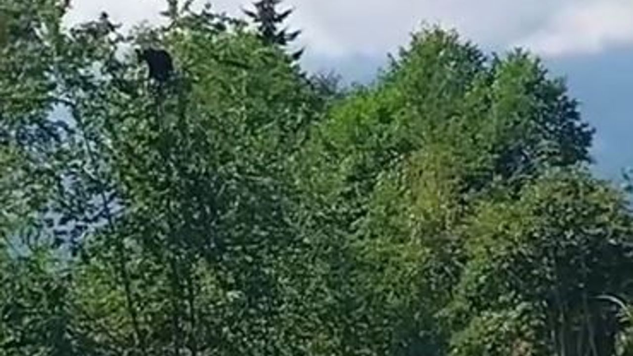 Ayının ağacın tepesine kadar çıktığını gören vatandaş, düşmesinden korkarak, "Ula in aşağı" diyerek seslendi. Görüntüler, sosyal medyada paylaşılarak büyük ilgi gördü.
