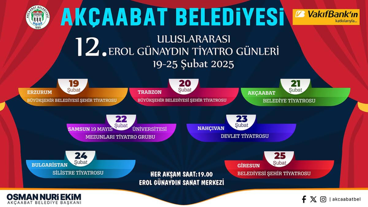 Akçaabat, kültür ve sanat alanındaki gücünü bir kez daha göstererek, 19-25 Şubat tarihlerinde 12. Uluslararası Erol Günaydın Tiyatro Günleri'ni düzenleyecek. Etkinlik, şehri tiyatro dünyasının önemli merkezlerinden biri haline getirmeyi hedefliyor.