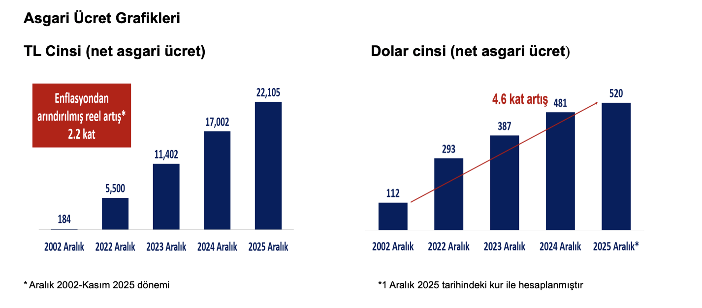 Asgari ücretin döviz kuru bazında da önemli bir artış gösterdiği gözlemleniyor. 2022 yılında 112 dolar olan asgari ücret, 1 Aralık 2025 kuru ile hesaplandığında 520 dolara çıkarak tam 4.6 kat arttı. Bu artış, Türkiye’nin gelişmekte olan ülkeler arasında asgari ücret konusunda önemli bir yükseliş kaydettiğini ortaya koyuyor.