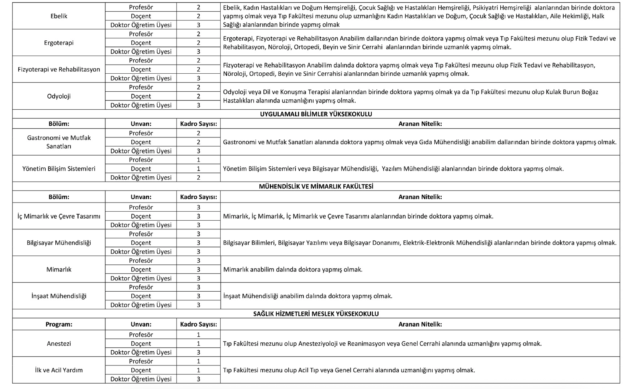 Alım yapılacak kadrolar arasında Profesör, Doçent, Doktor Öğretim Üyesi ve Öğretim Görevlisi pozisyonları bulunuyor. Adayların başvuru yapabilmesi için 657 sayılı Devlet Memurları Kanunu'nun 48. maddesinde belirtilen genel şartları taşıması gerekiyor. Ayrıca ALES'ten en az 70, yabancı dil sınavından ise en az 50 puan alma şartı bulunuyor. Yabancı dille öğretim yapan bölümler için bu puan sınırı 85'e yükseltilmiş durumda.
