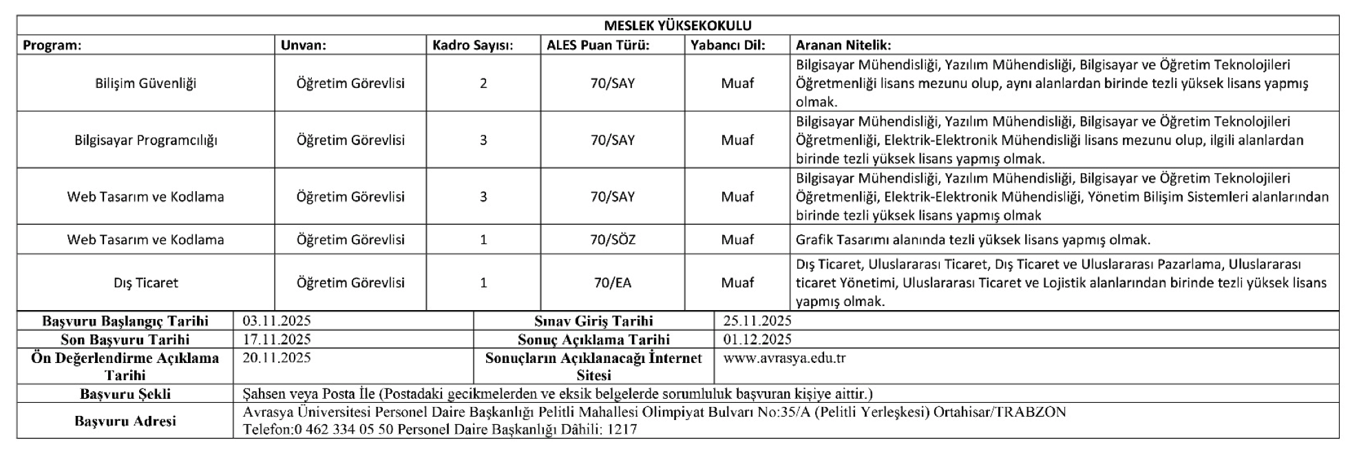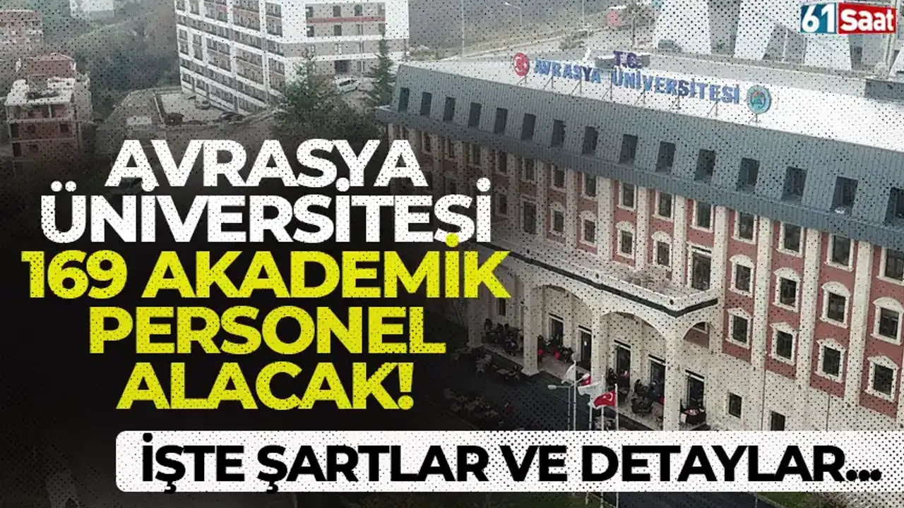 Trabzon'da faaliyet gösteren Avrasya Üniversitesi, öğretim üyesi ve öğretim görevlisi kadrolarında toplam 169 personel alımı yapacak. Resmî Gazete'nin 3 Kasım 2025 tarihli sayısında yayımlanan ilana göre, son başvuru tarihi 17 Kasım 2025 olarak duyuruldu.