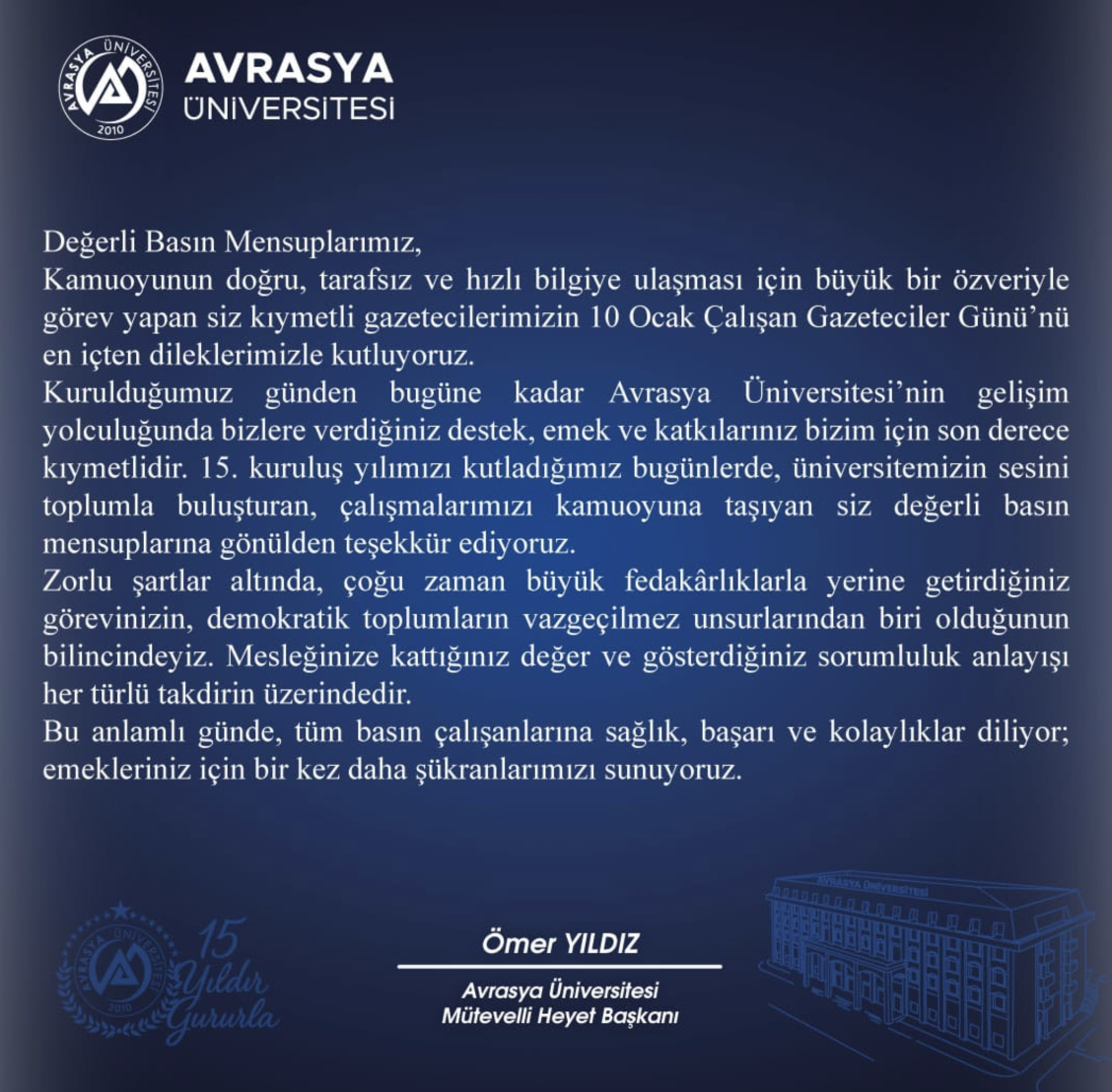 Kurulduğumuz günden bugüne kadar Avrasya Üniversitesi'nin gelişim yolculuğunda bizlere verdiğiniz destek, emek ve katkılarınız bizim için son derece kıymetlidir. 15. kuruluş yılımızı kutladığımız bugünlerde, üniversitemizin sesini toplumla buluşturan, çalışmalarımızı kamuoyuna taşıyan siz değerli basın mensuplarına gönülden teşekkür ediyoruz.