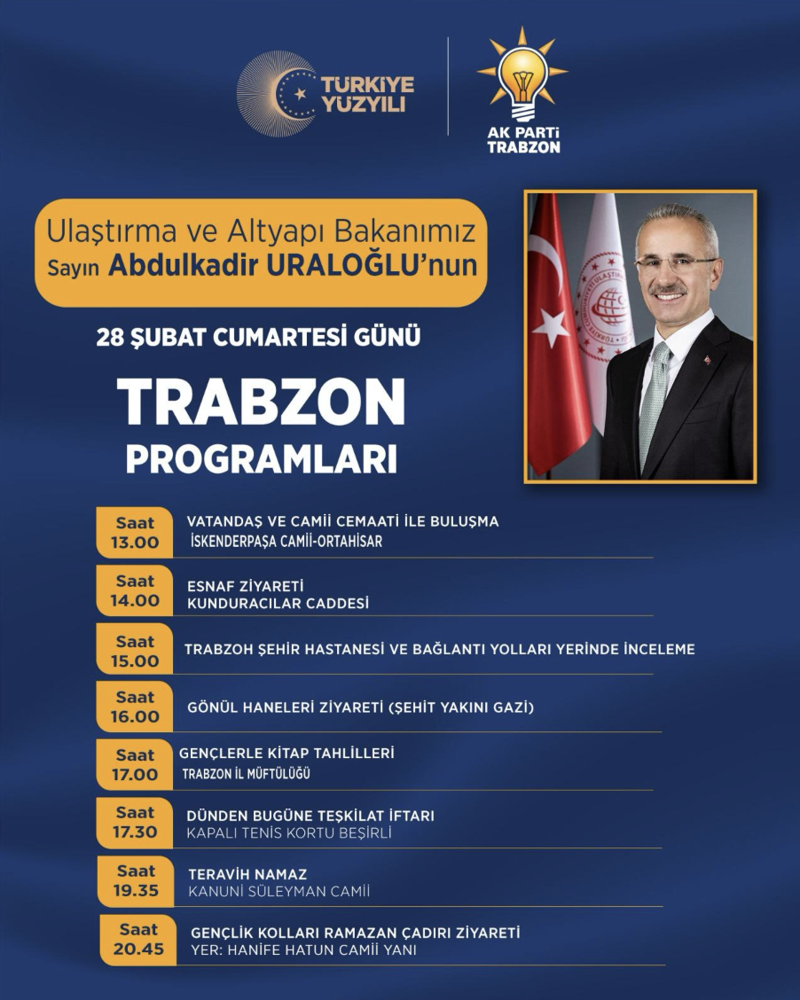 28 Şubat Cumartesi günü Trabzon’a gelecek olan Ulaştırma ve Altyapı Bakanı Abdulkadir Uraloğlu ilk olarak Ortahisar’da saat 13.00’te İskenderpaşa Camii’nde vatandaş ve cami cemaati ile bir buluşma gerçekleştirecek. 14.00’te Kunduracılar Caddesi’nde esnaf ziyareti gerçekleştirecek olan Bakan Uraloğlu saat 15.00’te ise Trabzon Şehir Hastanesi ve bağlantı yollarını yerinde inceleyecek.