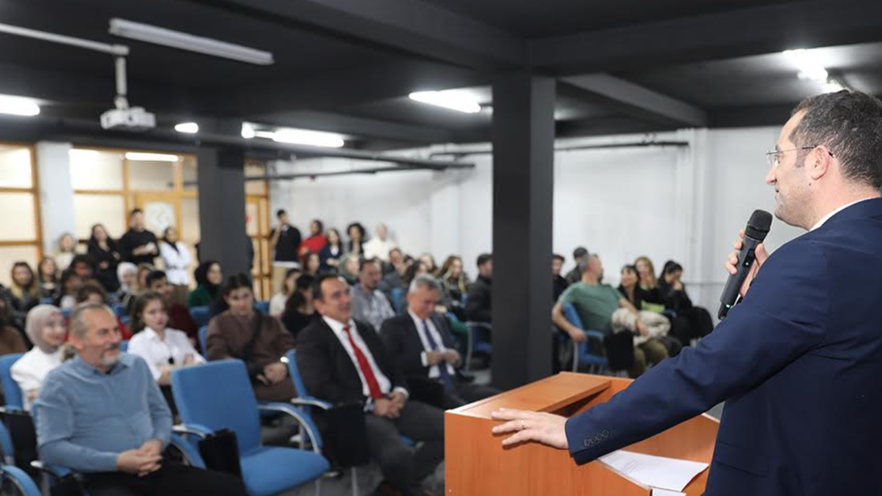 Başkan Ekim, “Gençlik buluşmaları kapsamında Akçaabat genelindeki hemen hemen her okula gidiyoruz ve burada eğitim gören gençlerimizle sohbet ediyoruz; fikir alışverişinde ve istişarelerde bulunuyoruz. Bugün de sizlerle bir aradayız; sizlerle sohbet edeceğiz. Diğer okul ziyaretlerimizde daha çok Akçaabat’ta yaptığımız işlerden ve yapmayı hedeflediğimiz projelerden konuştuk. Sizlerle ise Akçaabat’ımızın kültürünü, sanatını ve estetiğini konuşacağız. Öncelikle şunu belirtmek isterim ki Akçaabat’ımız kültür, sanat ve turizm şehridir. Bizler de bu sloganın altını dolduracak işler yapma hevesinde ve gayretindeyiz. Yılın 12 ayında, dört mevsiminde, Akçaabat’ımızda çeşit çeşit kültür ve sanat faaliyeti gerçekleştiriyoruz. Söyleşiler, konferanslar, sergiler, seminerler, sanat kursları, çalıştaylar, Uluslararası Akçaabat Müzik ve Halkoyunları festivalimiz, Türk Sanat Müziği ve Türk Halk Müziği konserleri kültür sanat faaliyetlerimizden bazılarıdır. Tüm bu etkinliklerle şehrimizin kültür ve sanat hayatını canlı tutmayı, hemşehrilerimizin sosyalleşmesine katkıda bulunmayı amaçlıyoruz. Kültür ve sanat etkinliklerimizin yanı sıra yine kültür sanat kursları adı altında birçok kurs açıyoruz. Açtığımız sanatsal kursları tek çatı altında topladık ve Akçaabat Belediyesi Sanat Akademisi’ni oluşturduk. Burada Halk Eğitim Müdürlüğü ile işbirliği halinde alanında uzman eğitmenler tarafından 13 farklı branşta kurs veriliyor. Estetik görüşü ve sanat anlayışı yüksek olan Güzel Sanatlar Fakültemizin siz değerli öğrencilerinin bu kurslardan faydalanmasını yürekten arzu ederim. Estetik demişken şehrimizin estetiğine dokunan, şehrimizin siluetine yakışan işler ve projeler yapmaya da özen gösteriyoruz. Güzel Sanatlar Fakültemizin bulunduğu bu alanın yakın çevresinden sizlere biraz bahsetmek isterim. Öncelikle, fakültemizin tam karşısında ve daha önce atıl durumda bulunan eski tekel binamız, artık beş yıldızlı bir otel. Şehir merkezimizde böyle bir otelin olması hem şehrimizde yaşayanlar için hem de şehrimize gelen yerli ve yabancı ziyaretçiler için müthiş bir kazanım. Devamında Akçaabat’ımızın incisi sahil parkımız, etap etap yaptığımız çalışmalar neticesinde, yenilenen yüzüyle daha modern ve fonksiyonel hale geldi. Yine sahilde ilginizi çekecek diğer bir husus da yöresel ürün satış reyonlarımız olacaktır. Burada hanımların el emeği göz nuru yöresel ürünleri satılıyor. Şehrin içerisinde yayalaştırdığımız ve trafiğe kapattığımız İstiklal Caddemiz var. Bu cadde tarihten beri Akçaabat’ın kalbi olan bir caddedir. Tüm ticaretler bu sokakta yapılır. Hatta köftenin doğduğu sokaktır İstiklal Caddesi ve Orta Cadde. İstiklal Caddesi’nde ve Orta Cadde’de sokak sağlıklaştırma, cephe ve tabela yenileme çalışmaları yaptık. İstiklal Caddesi’ni adeta açık hava AVM’sine çevirdik. Yine Akçaabat’ın tam kalbinde yer alan ve gün içerisinde insan sirkülasyonunun oldukça fazla olduğu Fatih Parkı’nı tamamen yeniledik. Yine Akçaabat’ımızın incisi tarihi Ortamahalle’mizde sokak sağlıklaştırma çalışmaları yaptık ve 1. Etabını tamamladık. Tarihi mahallemizde bulunan tarihi yapıyı da restore ederek Ortamahalle Müzesi olarak şehrimize kazandırdık. Bu müzede ise Akçaabat’ın tarihi ile ilgili eserler sergileniyor.” Dedi.