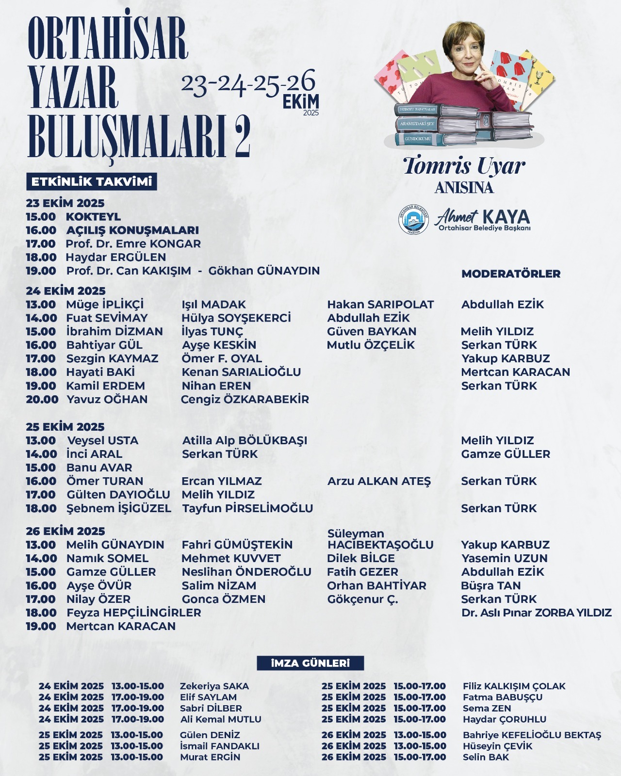 Ortahisar Belediyesi tarafından 29 Ekim Cumhuriyet Bayramı kutlamaları kapsamında düzenlenen ve geçen yıl ilki yapılan ‘Ortahisar Yazar Buluşmaları’nın ikincisi, bu yıl 23-26 Ekim 2025 tarihleri arasında gerçekleştirilecek. Geçen yıl Hasan İzzettin Dinamo anısına düzenlenen Ortahisar Yazar Buluşmaları, bu yıl Türk öykücülüğünün usta kalemi, yazar ve çevirmen Tomris Uyar anısına düzenlenecek. Etkinlik kapsamında birbirinden değerli 68 yazar ve şair, söyleşi, dinleti ve imza günleriyle dinleyici ve okurlarla buluşacak. Ortahisar Belediye Başkanı Ahmet Kaya'nın öncülüğünde oluşturulan Düzenleme Komitesi, Melih Yıldız, Serkan Türk, Olgun Önder ve Erdal Eksert’ten oluşuyor.