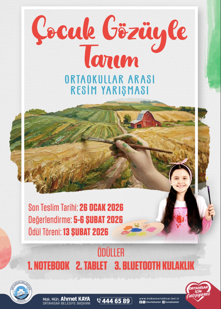 Çocukların ve gençlerin üretim bilinciyle yetişmesinin çok önemli olduğunu ifade ederek öğrencileri bu anlamlı yarışmaya katılmaya davet eden Ortahisar Belediye Başkanı Ahmet Kaya, “Bizler, çocuklarımızın toprağı tanıyan, üretimin değerini bilen ve doğayla barışık bireyler olarak yetişmesini çok önemsiyoruz. ‘Çocuk Gözüyle Tarım’ yarışmamızla, geleceğin üreticilerini ve bilinçli tüketicilerini küçük yaşta tarımla buluşturmayı hedefliyoruz. Tüm ortaokul öğrencilerimizi, hayal dünyalarını ve bakış açılarını resimle ifade etmeye, bu anlamlı yarışmaya katılmaya davet ediyorum” dedi.