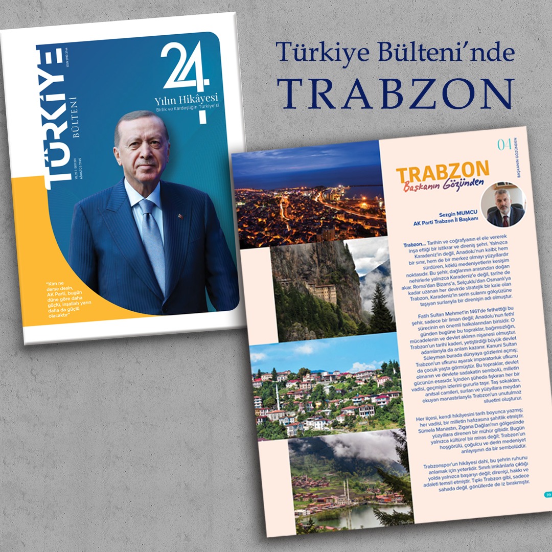 AK Parti Trabzon İl Başkanı Dr. Sezgin Mumcu, Türkiye Bülteni dergisinin “Başkanın Gözünden” köşesinde kaleme aldığı yazıda bu tarihi ve kültürel zenginlikleri aktarırken, Trabzon’un Türkiye Yüzyılı’ndaki güçlü konumuna da vurgu yaptı.