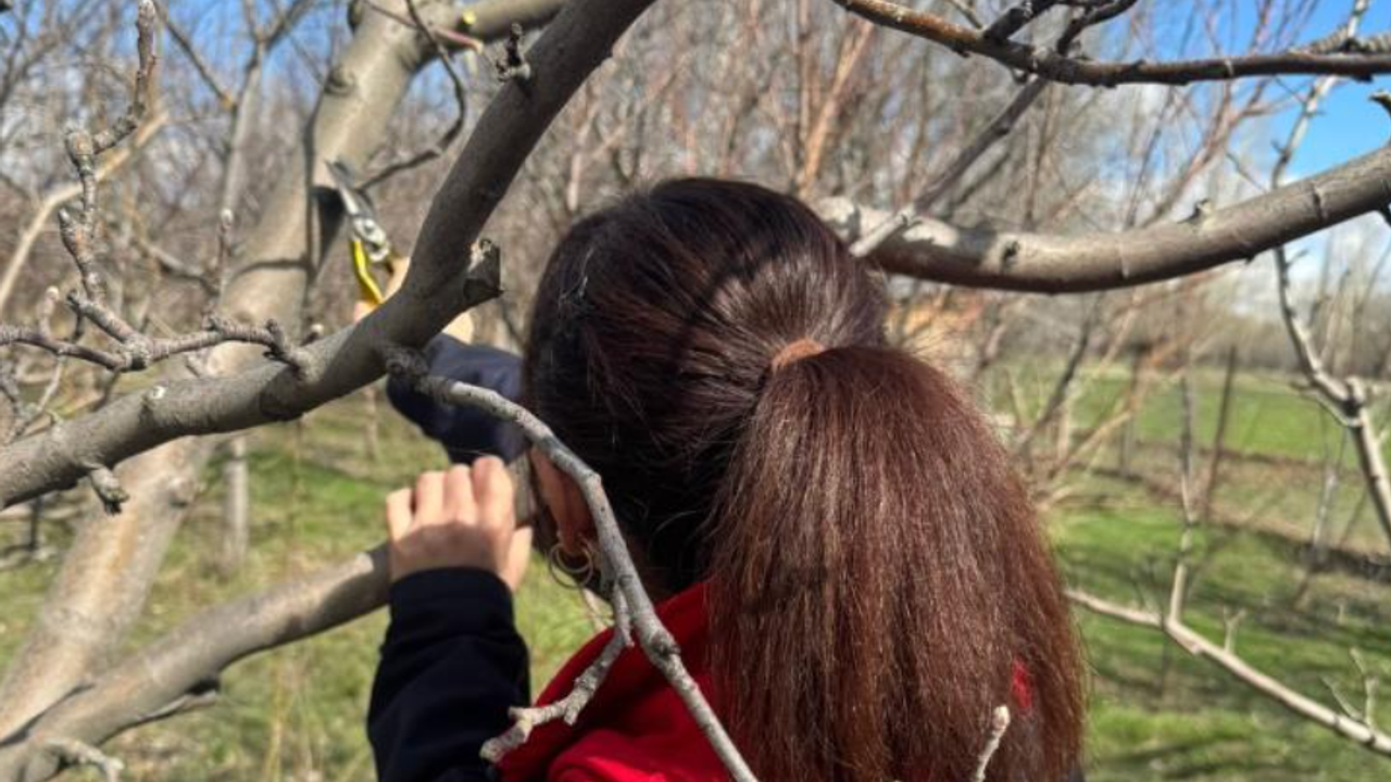 Yukarıkırzı köyündeki üretici Ebubekir Yaşa'ya ait meyve bahçesinde yapılan budama uygulamasında ağaçların durumu incelenirken, doğru budama teknikleri Yaşa'ya uygulamalı olarak gösterildi.